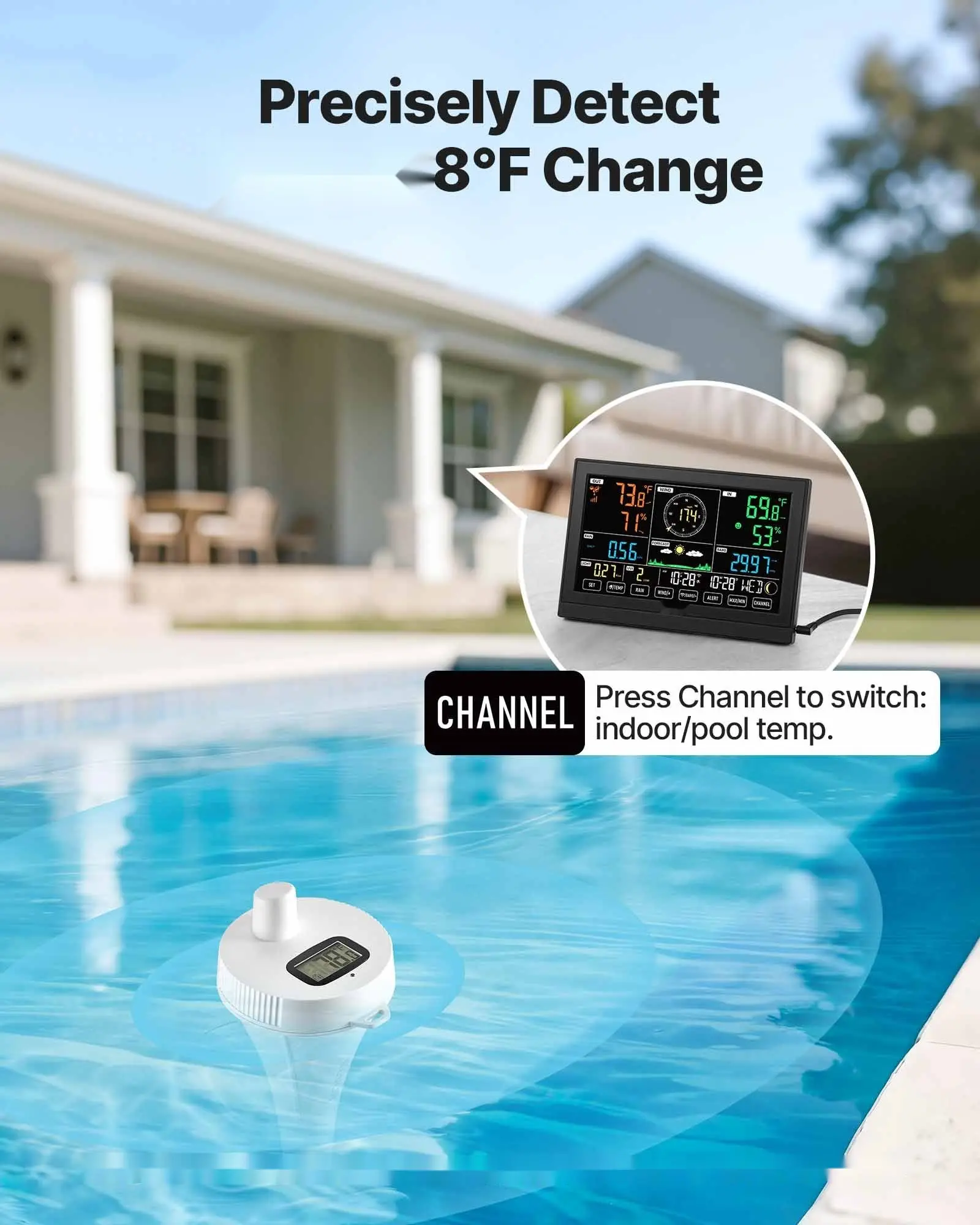 ·8-in-1 Weather Monitoring: Our WiFi weather station tracks temperature, humidity, rainfall, wind speed & direction, plus pool water temperatureâall from home. Includes dew point, moon phase, and 6â12h weather forecasts (displayed on indoor display)