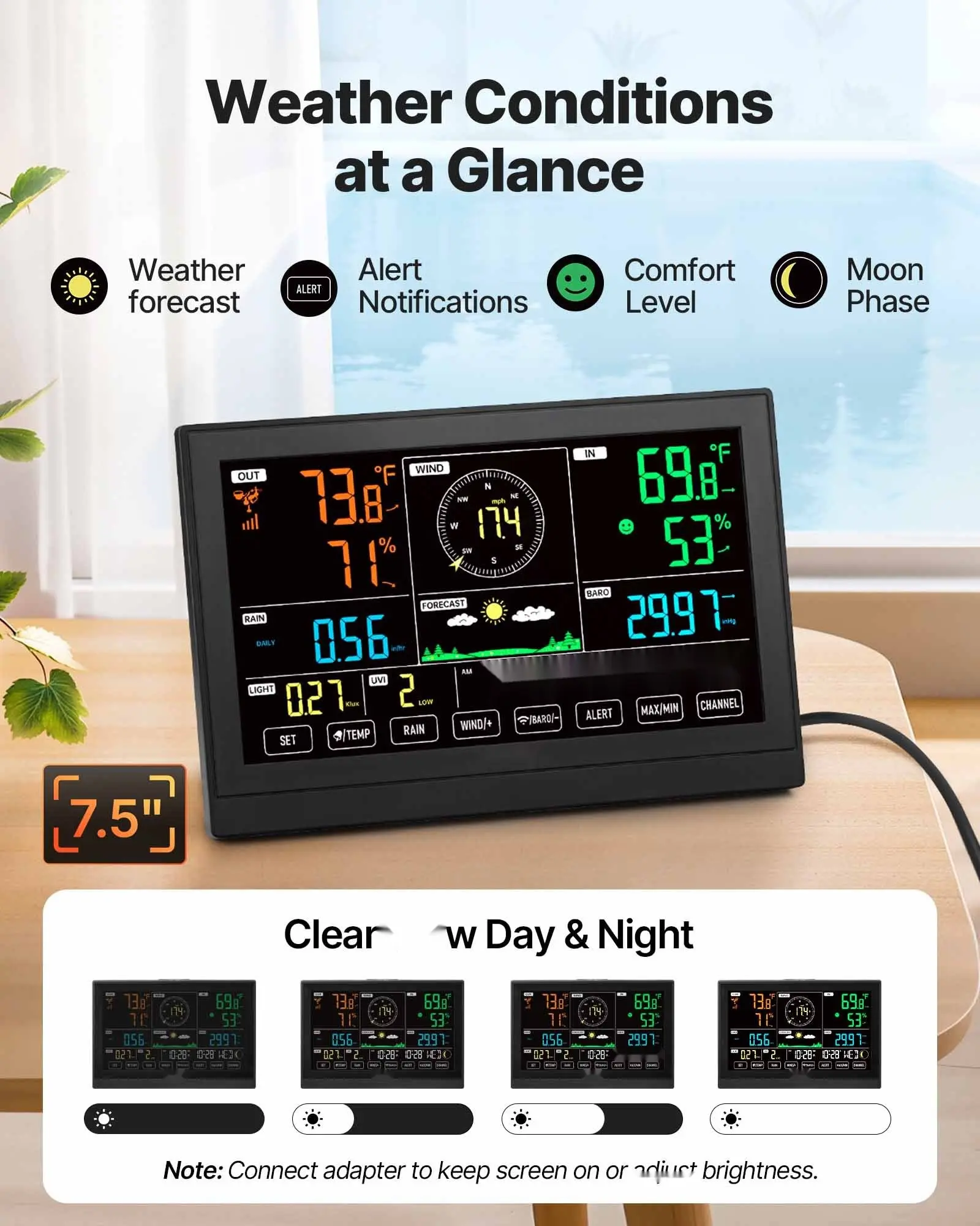 ·7.5-Inch Large Display: Enjoy a crystal-clear view of all your weather data with our wireless weather station. The large HD display with 4 brightness levels fits well in your living room or bedroom for day or night reading