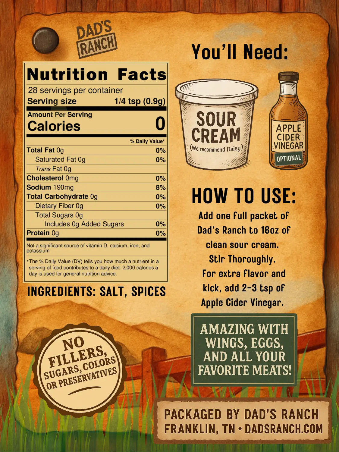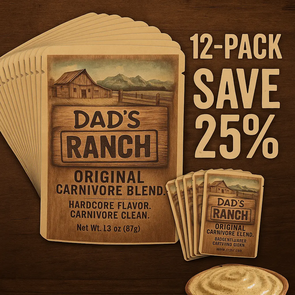 Each packet of Dad’s Ranch – Original Carnivore Blend is packed with bold, primal flavor and none of the junk. No sugar, no fillers, no preservatives — just hardcore taste designed to dominate wings, eggs, steaks, and everything you throw at the grill.