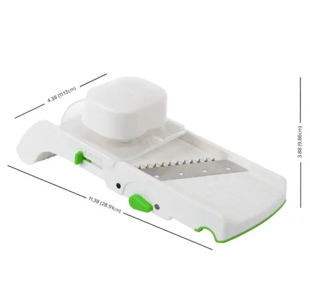 Prep Solutions Multi Slicer is the perfect tool for making cucumber salad zucchini noodle pasta apple tart potato gratin and more. With four thickness settings ranging from 1mm up to 5mm plus julienne option the possibilities are endless. Safety hand guard with stainless steel prongs secures produce in place ensuring safe and secure slicing every time. Non skid base keeps slicer firmly in place on any flat surface. Bowl grooves allow you to slice directly into a mixing or salad bowl. Dishwasher safe. Measures 11.38 inches wide by 4.38 inches deep by 3.88 inches high.