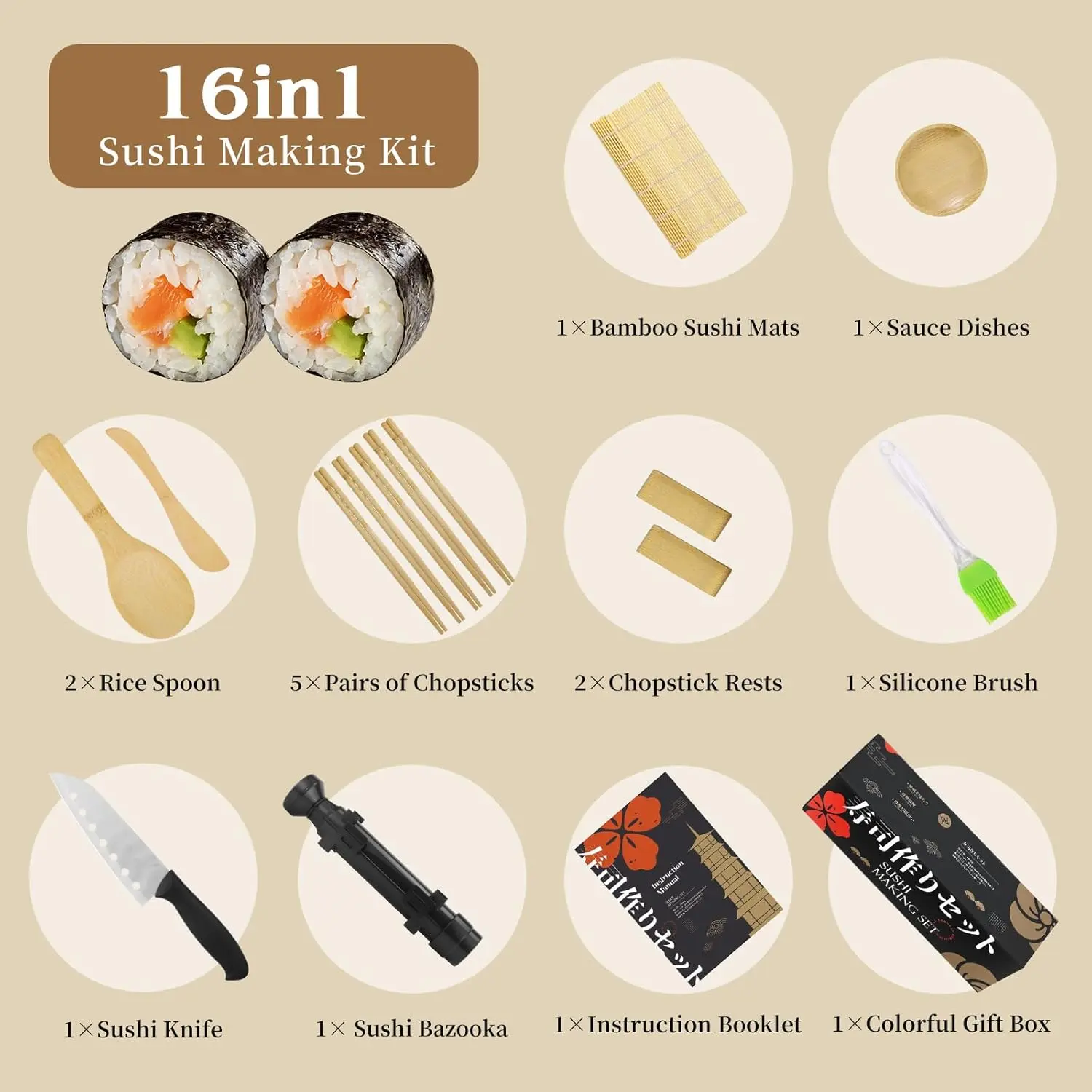 This professional sushi-making kit includes everything needed: 1 bamboo sushi mat, 1 sushi bazooka, 5 pairs of chopsticks, 1 sauce dish, 1 rice spoon, 1 sushi skewer, 1 sushi knife, 2 chopstick rests, 1 Silicone Brush, 1 Production Guide, 1 Colorful Gift Box. All tools for sushi success are here!