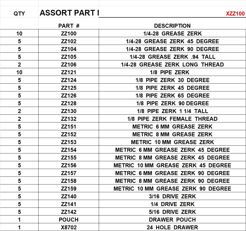 XZZ100 STANDARD GREASE ZERK ASSORTMENT