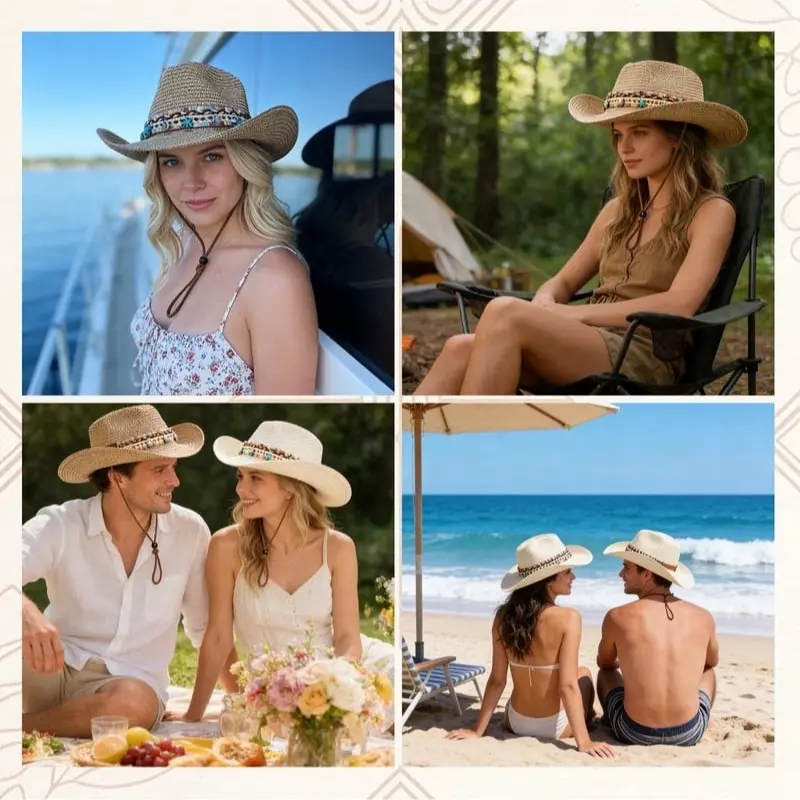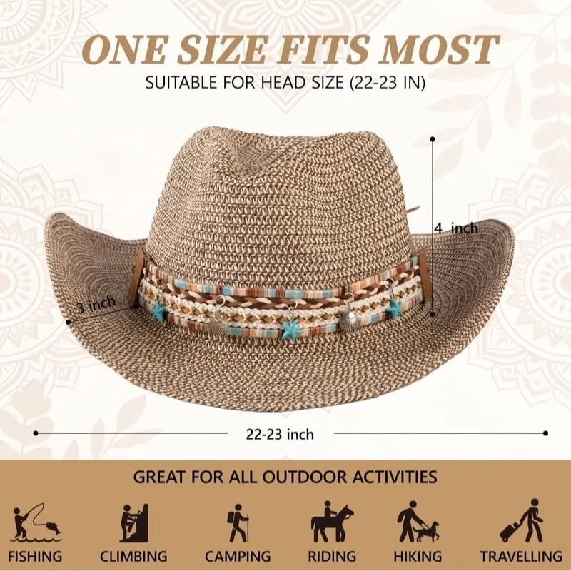 Bohemian-Style Woven Decorative Straps Straw Cowboy Hat Western Sun Hat for Summer Beach Wear