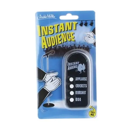 ·From the Manufacturer:This 3-1/2" (8.9 cm) electronic Instant Audience noisemaker comes with four sounds - applause, crickets, rimshot and a booing audience. The perfect thing for an instant ego boost or giving effortless feedback to others. Plastic. Three LR44 batteries included.