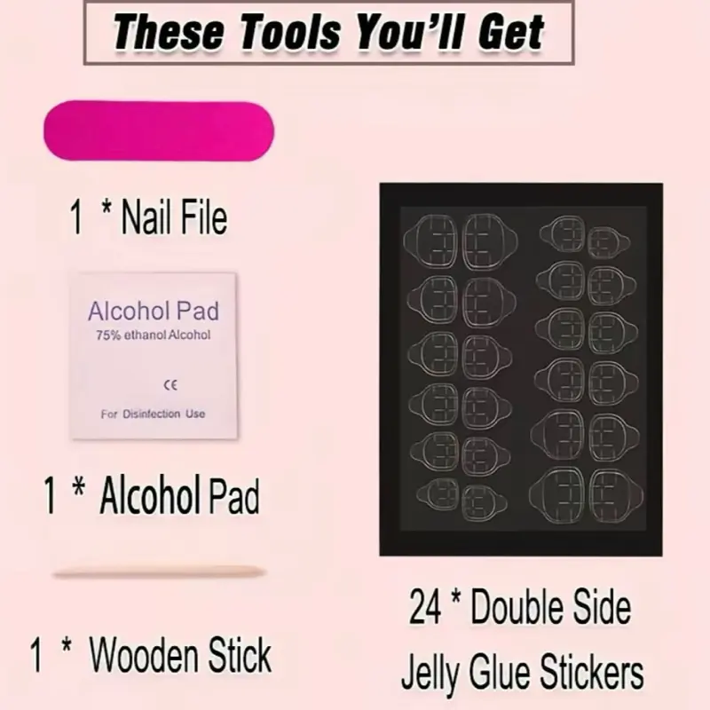 ·Professional Prep Kit: Includes high-strength nail glue, pressure-sensitive adhesive tabs, a precision buffer, and a signature cuticle pusher.