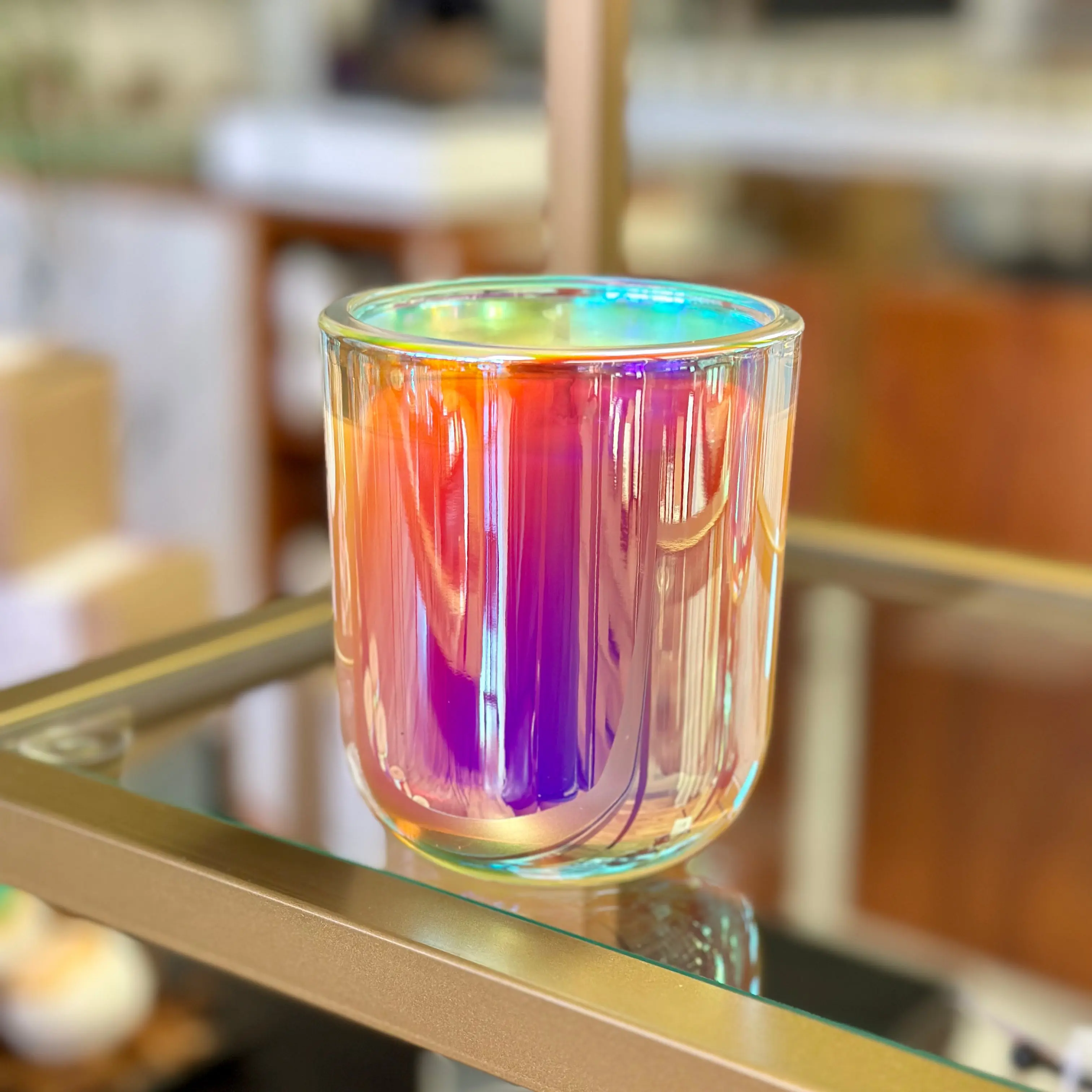 Poured in a beautiful, thick, iridescent jar. Glows with a vivid spectrum of hues that changes with the angle and lighting. It's truly a magical experience!