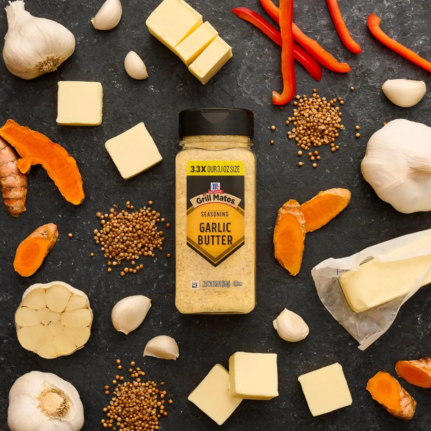 McCormick Grill Mates Garlic Butter Seasoning, 10.5 oz, brings classic savory flavor to your grill. Perfect for steak, burgers, poultry, ribs, fish, and vegetables. Use 1 to 2 tbsp per 1 lb. of meat or veggies. This versatile blend contains garlic, butter, and McCormick® spices. A shake adds maximum flavor all season long. Ideal for weeknight meals or weekend cookouts. Try it on beef, turkey burgers, seafood, potatoes, or popcorn.