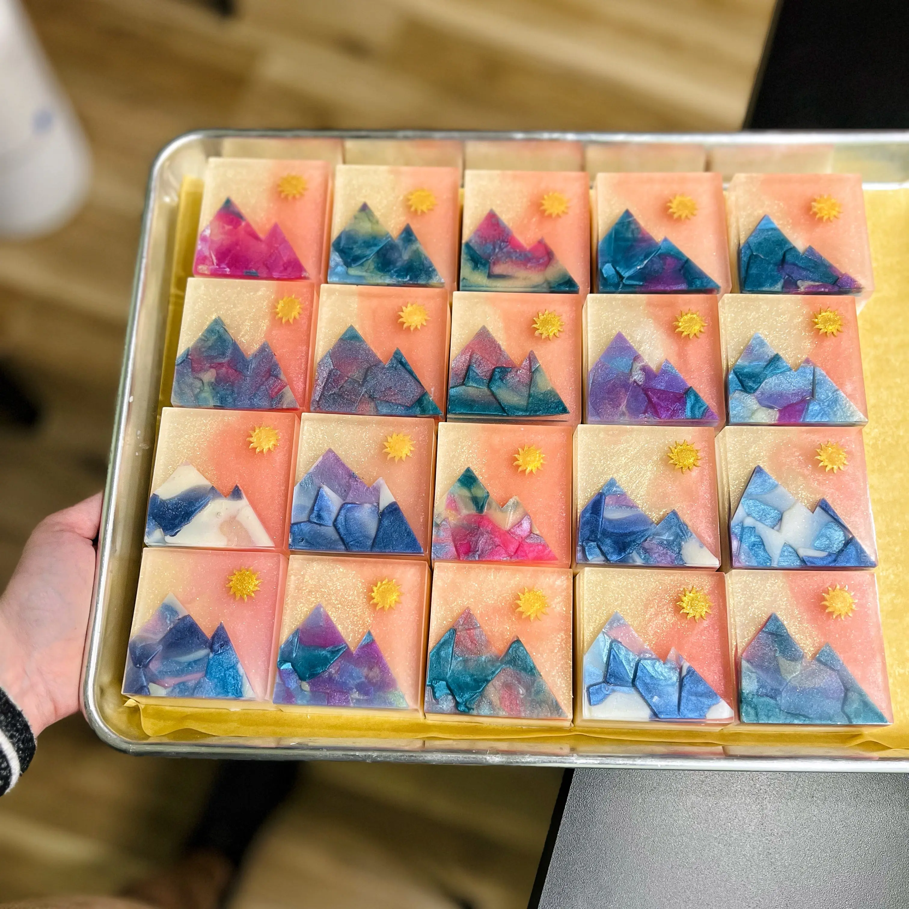 This soap is intricately designed to look like a beautiful mountain sunset. Featuring sparkling sunshines and hand-cut mountains - each bar is completely unique!