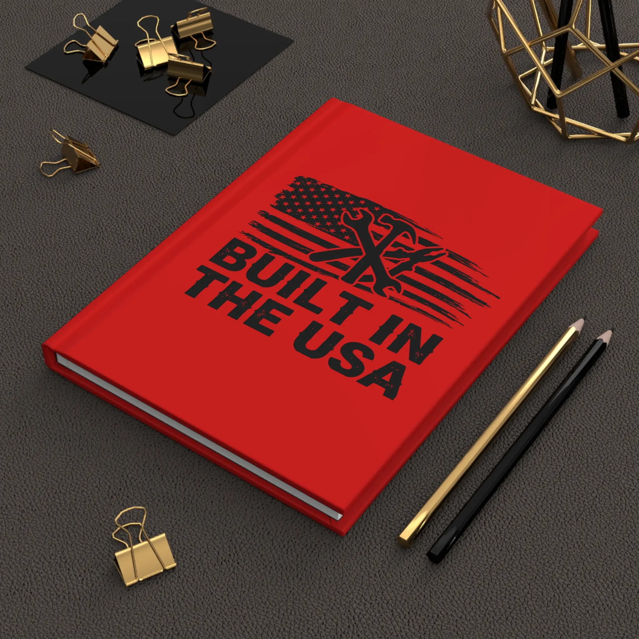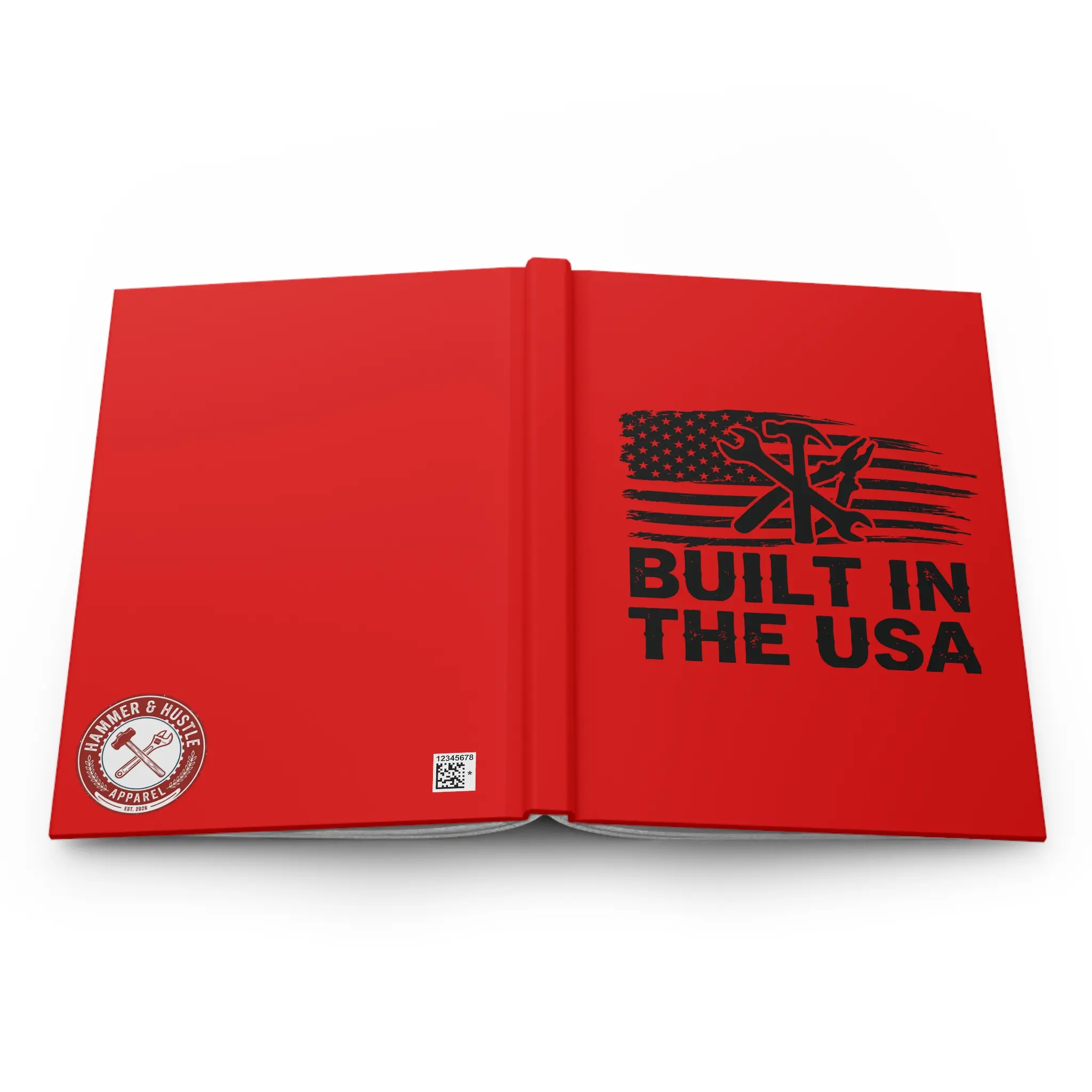 A bold, matte hardcover journal designed for hands-on makers and proud patriots. The bright red cover features a distressed American flag and tool emblem that reads “Built in the USA,” giving the book a hardworking, authentic feel. Inside, 150 lined pages sit on a flexible sewn spine so the journal lies flat as you sketch blueprints, jot measurements, or capture shop notes. Perforated pages let you share or archive individual sheets without damaging the binding. Durable matte lamination and full wraparound printing mean the design stays vivid through daily use in the garage, workshop, or on the jobsite.