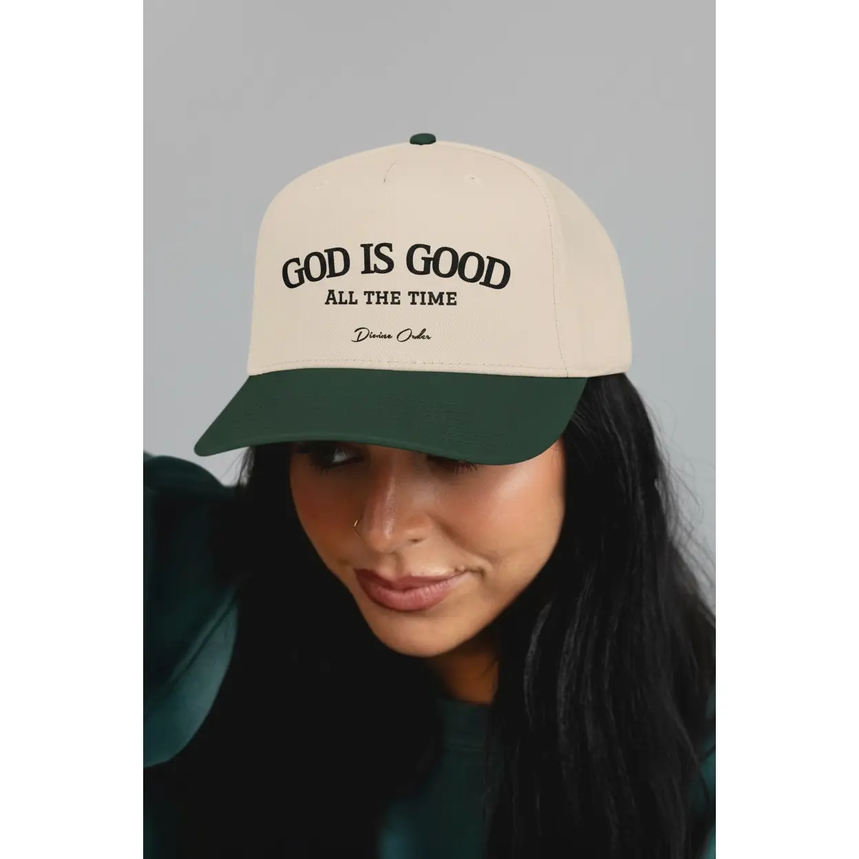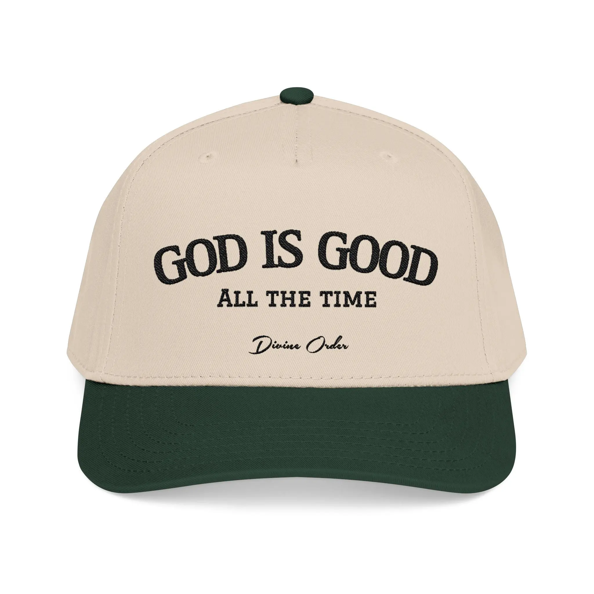 This mid-profile baseball cap carries a quiet, confident message: “GOD IS GOOD — ALL THE TIME.” The structured five-panel silhouette and seamless front panel give the embroidery room to sit clean and proud. Soft cotton-poly fabric with a matching undervisor keeps the look classic and comfortable, while the durable snap closure and sewn eyelets make it ready for daily wear. It slips into mornings at the coffee shop, volunteer shifts at church, weekend drives, or small-group meetups — a simple way to wear faith without shouting. The slightly curved brim and neutral two-tone palette let the message take center stage while still feeling grounded and wearable.