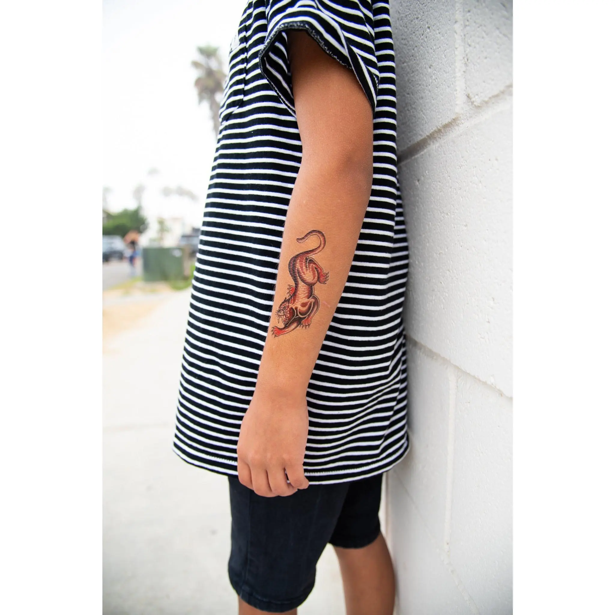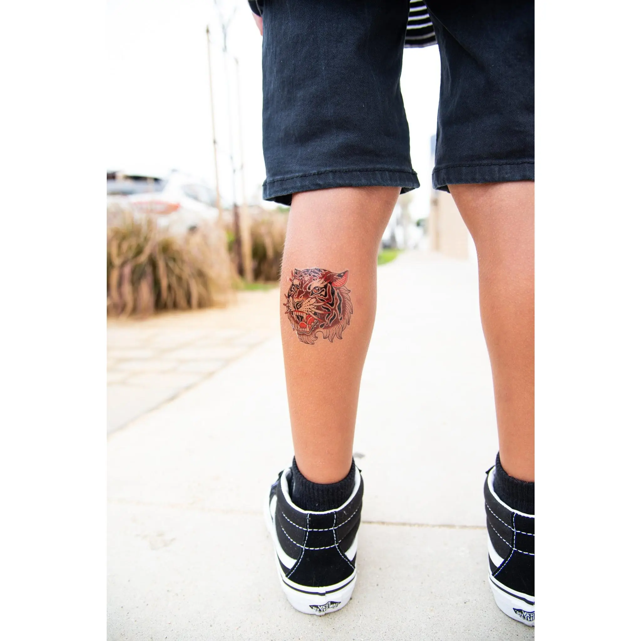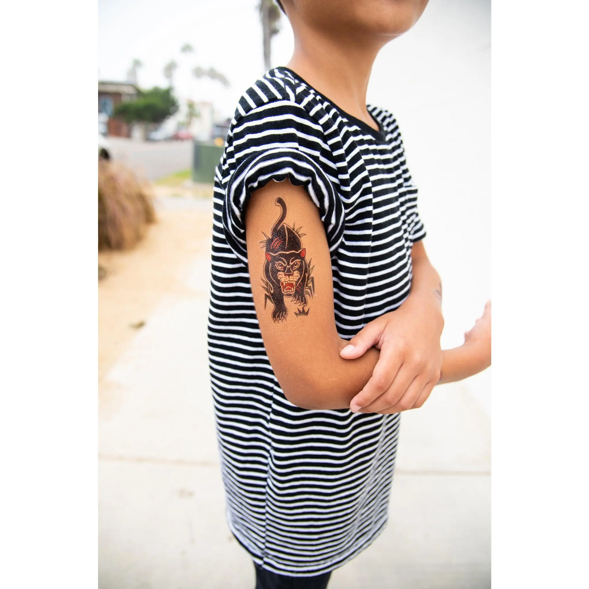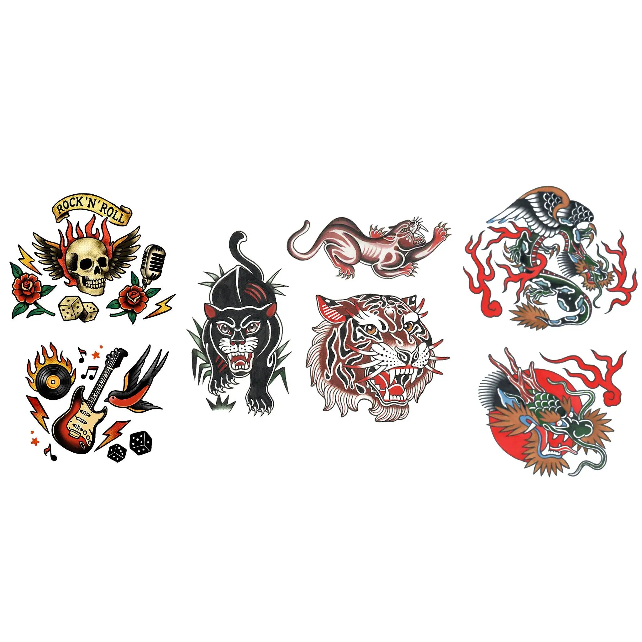 Fan of traditional tattoo art? This bundle brings together three bold designs inspired by classic tattoo shop flash. From roaring big cats to battle ready warriors and rock inspired icons, the Traditional Tattoo Legends Bundle delivers iconic old school tattoo energy in a kid friendly temporary tattoo format. This discounted set includes two full sleeve tattoos and one patchwork flash sheet, giving kids multiple ways to mix, match, and create their own legendary look. Perfect for kids who love bold art, costumes, parties, or just want to show off some serious attitude. Key Benefits • Classic traditional tattoo style inspired by real tattoo flash• Mix and match designs to create custom tattoo looks• Waterproof and play proof for everyday adventures• Non toxic and skin safe temporary tattoos for kids• Easy to apply and remove with no commitment What’s Included 1 Let’s Rock Full Sleeve Temporary TattooRock inspired traditional tattoo sleeve packed with bold flash style imagery. 1 Warrior Full Sleeve Temporary TattooClassic tattoo warrior design bringing strength and fearless energy. 1 Ferocious Fangs Patchwork SheetIncludes three bold big cat designs: • Tiger• Sabertooth Tiger• Panther Artists: Phil Hatchet Yau and Daniel Marin Product Details Temporary tattoos are water applied and designed to look like real tattoo art while remaining safe and easy for kids to wear. Water resistant and designed to last several days with proper care. Great for birthdays, dress up, Halloween costumes, photo shoots, or everyday fearless self expression. APPLICATION INSTRUCTIONS 1 Clean and dry skin completely2 Remove clear protective film3 Press tattoo design side down onto skin4 Soak the back of the paper with a warm wet towel for at least 10 seconds5 Slide paper off and allow tattoo to dry