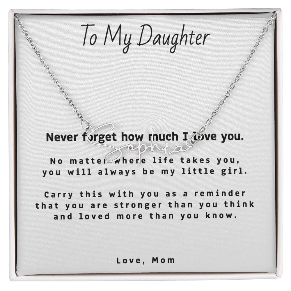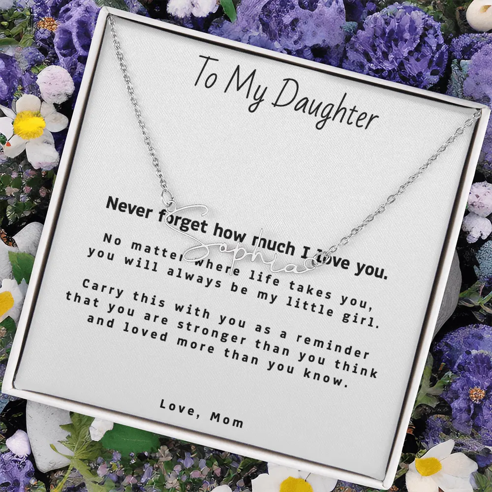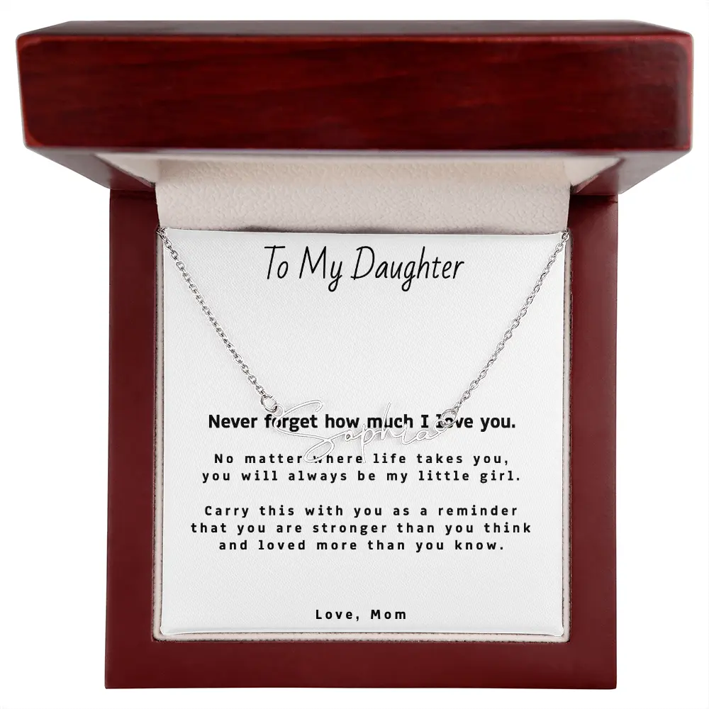 This personalized name necklace is a timeless gift. It features a heartfelt message: "Never forget how much I love you. No matter where life takes you, you will always be my little girl." It’s a daily reminder of love, strength, and connection. Perfect for birthdays, graduations, or special moments. Your daughter will cherish this gift forever.