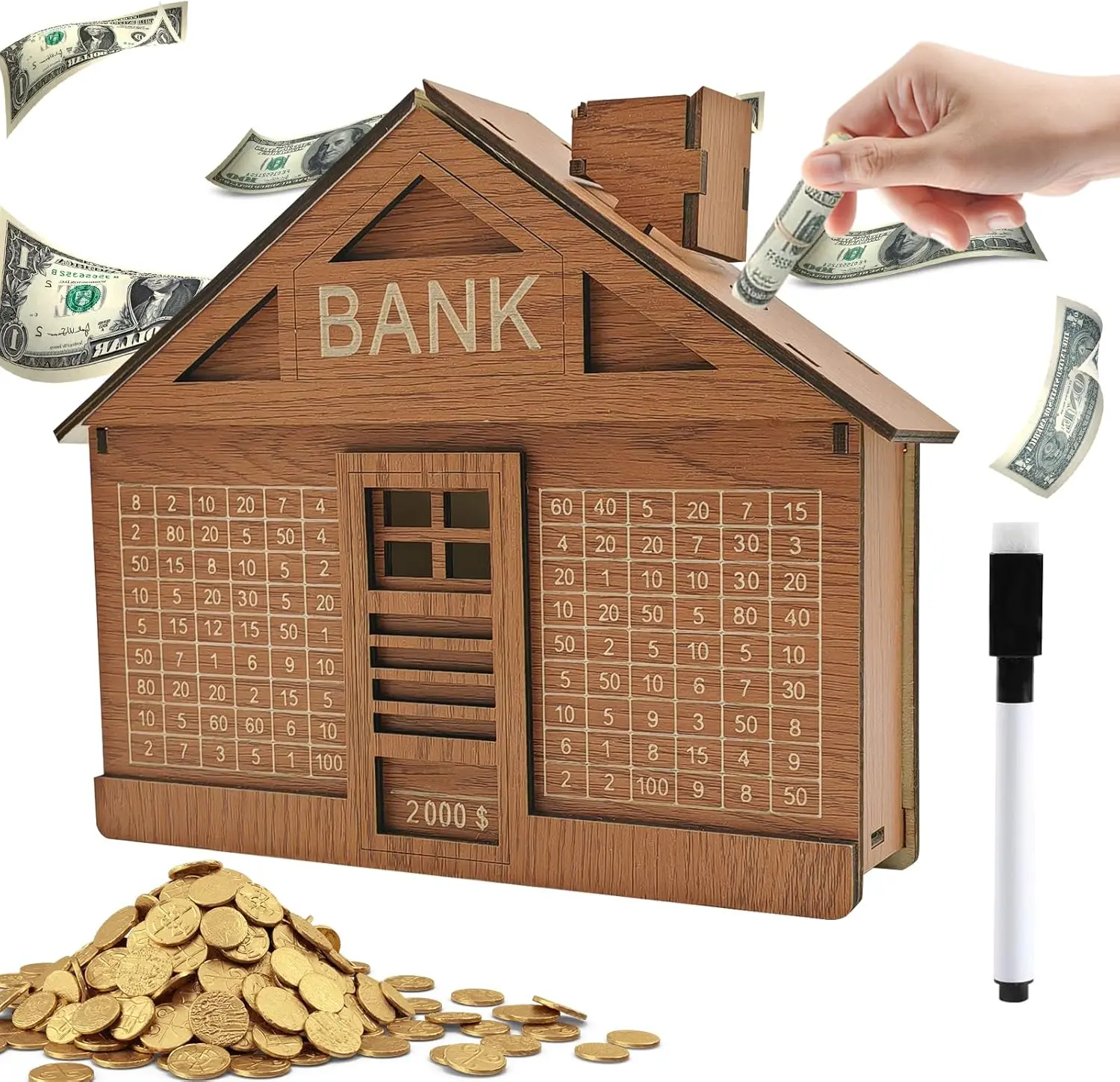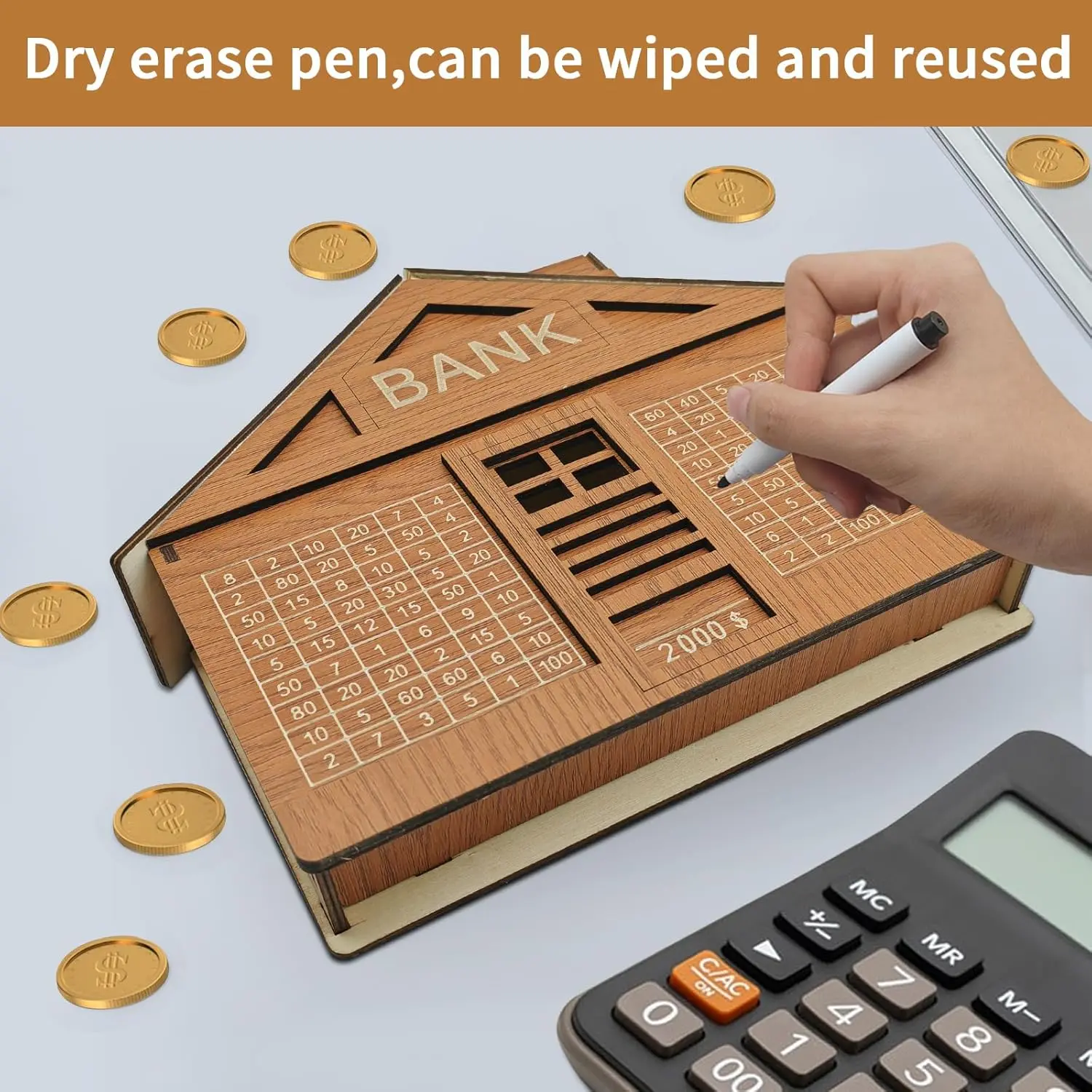 Stay motivated and reach your savings goals with this durable wooden cash vault box. Designed with a smooth surface for easy writing and erasing, it lets you track progress using the included dry erase pen. Reusable, practical, and perfect for daily saving habits at home or office. Ideal for anyone building better money habits in a simple and organized way.