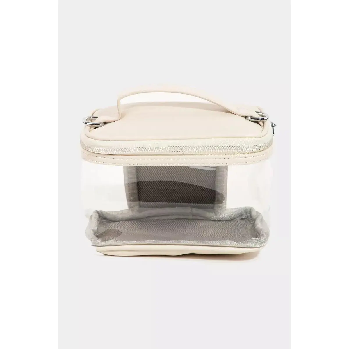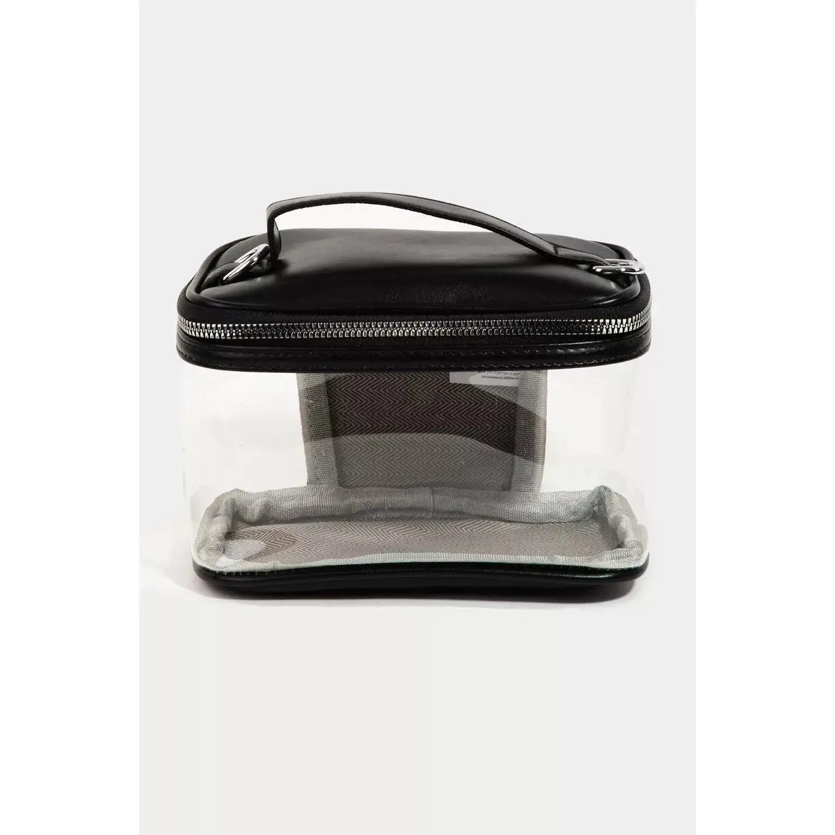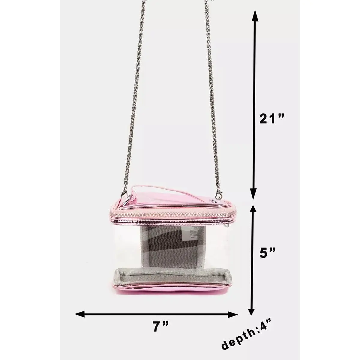 This clear travel handbag combines practicality with a touch of glamour. The transparent design allows for quick identification of contents, making it ideal for travel or everyday organization. The metallic pink trim adds a stylish and eye-catching detail. Crafted from durable materials, this handbag features a secure zipper closure and a convenient top handle for easy carrying. Perfect for storing toiletries, cosmetics, or accessories, this versatile handbag is a must-have for any stylish traveler.