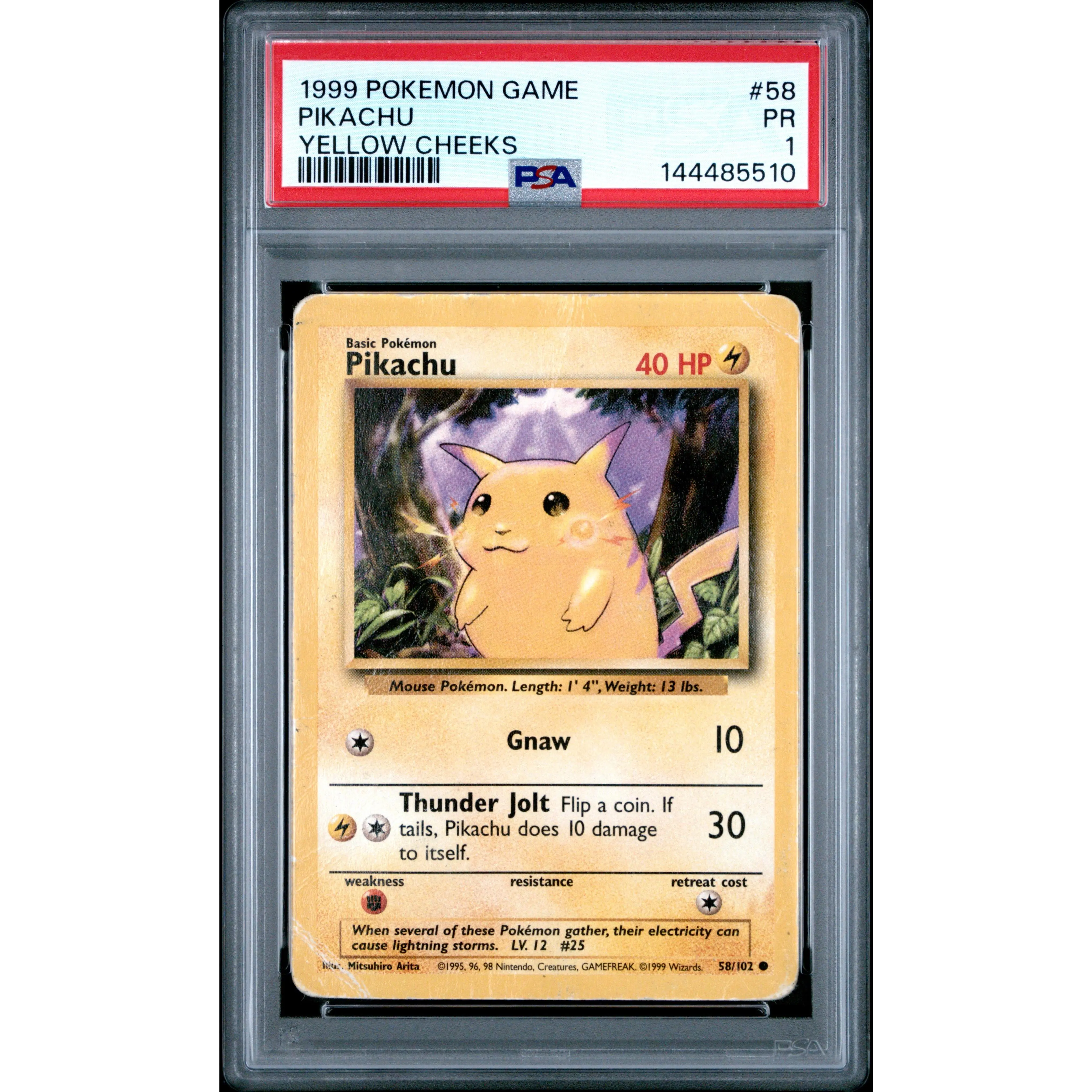 You are purchasing the exact card pictured! 1999 Pokemon Game #58 Pikachu Yellow Cheeks. Grade Information:PSA 1 PR. Browse our selection of other Graded and Raw Singles!Due to the nature of the plastic, there may be minor scrathes or scuffing on slabs.