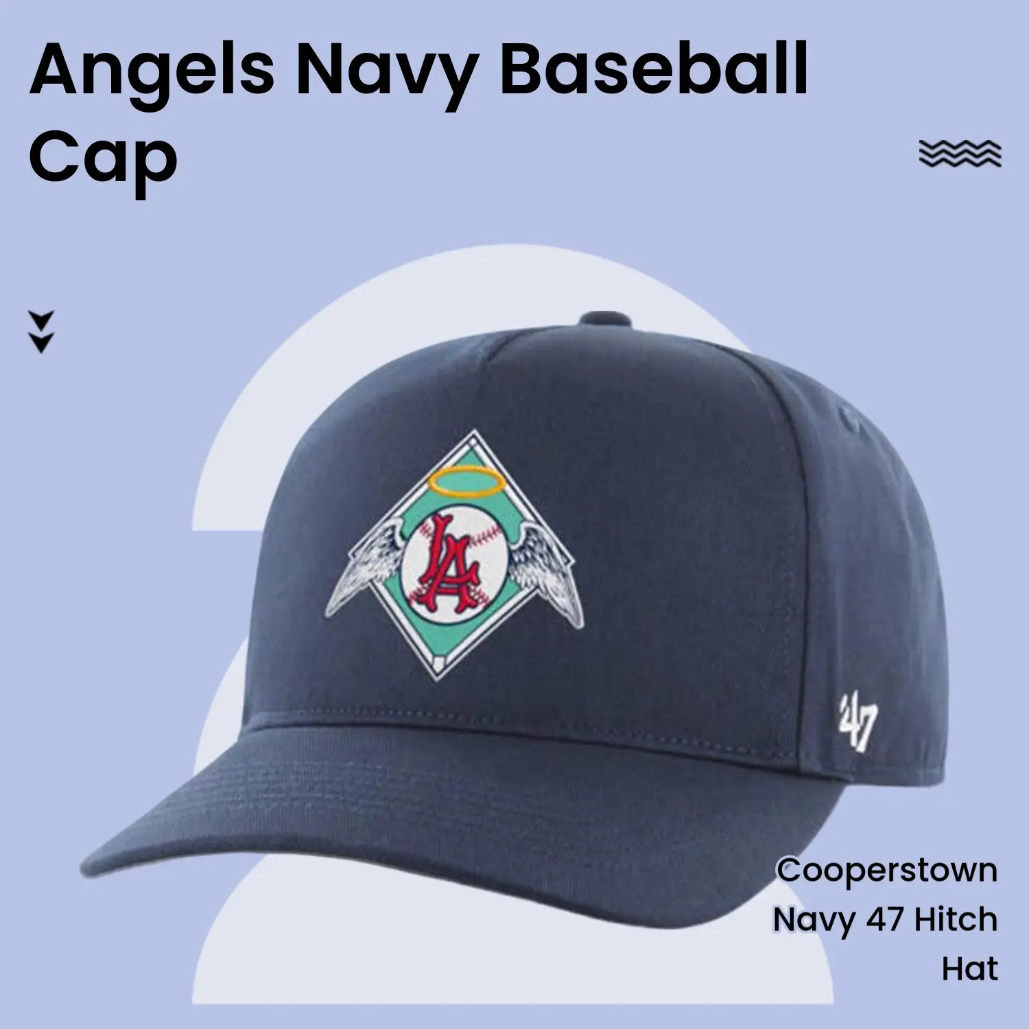 The Los Angeles Angels Cooperstown Navy 47 Hitch is a stylish cap featuring a prominent Angels logo. It's crafted from fabric, ensuring a comfortable fit. The cap has a 108*56 GARMENT WASH finish, giving it a unique look. Perfect for fans, it combines functionality with team spirit.