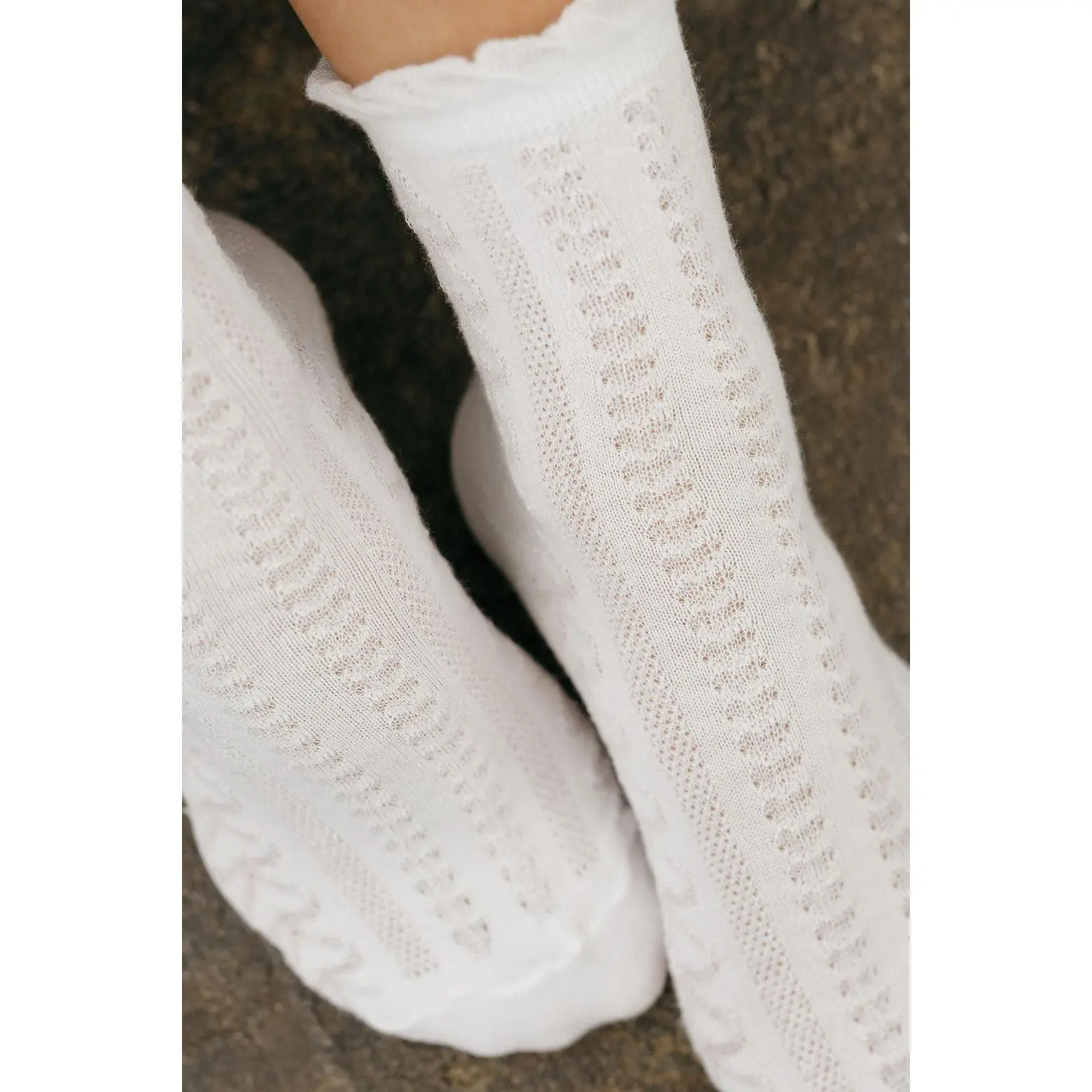 The Jessie Socks are a sweet everyday essential with a timeless, feminine feel. Designed in a soft ivory hue, these socks feature an airy open‑knit ribbed pattern that adds subtle texture and breathability. Finished with a delicate scalloped cuff, they bring a charming, vintage‑inspired touch to any outfit. Perfect for pairing with sneakers, flats, or boots, the Jessie Socks blend comfort and style for effortless daily wear.