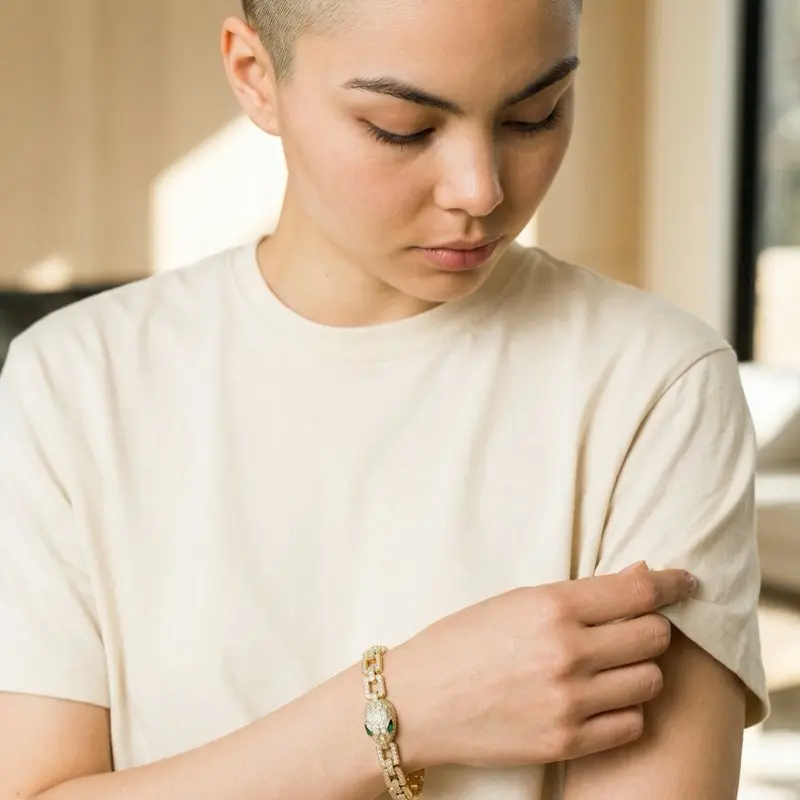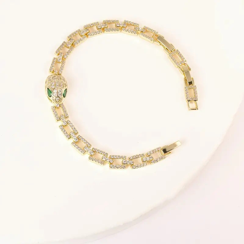 A bold snake head design with green stone eyes and full shine links — luxury and attitude in one bracelet.