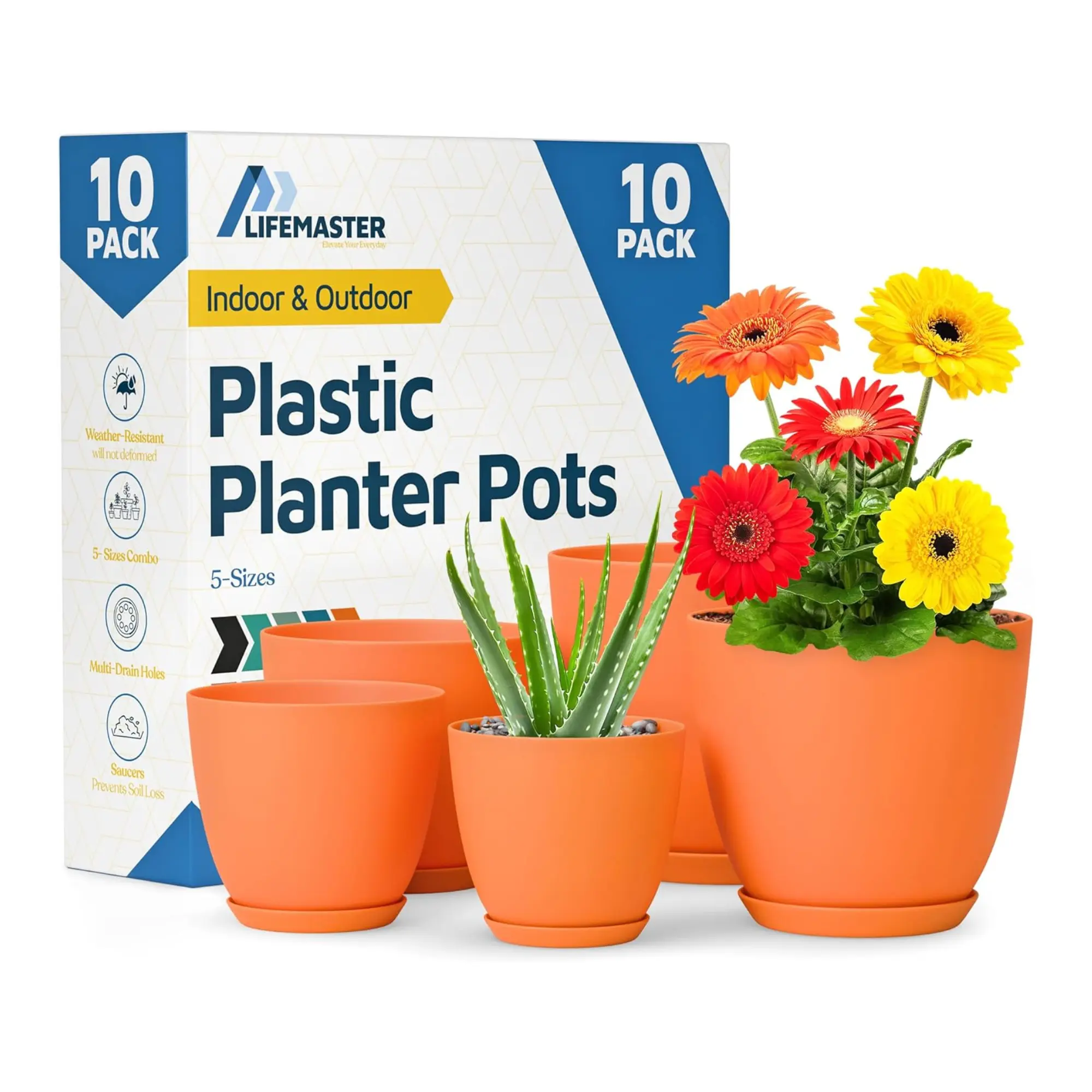 Plant Pots with Drainage Holes & Saucers 10 Pack, Indoor & Outdoor Stackable Space-Saving Planters for Houseplants & Flowers, (7", 6.7", 6", 5.3", and 4.8" Inches), Durable & Weatherproof