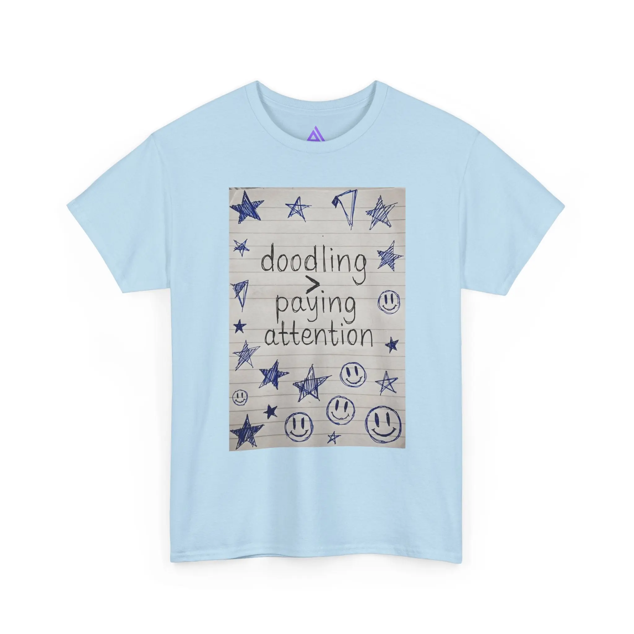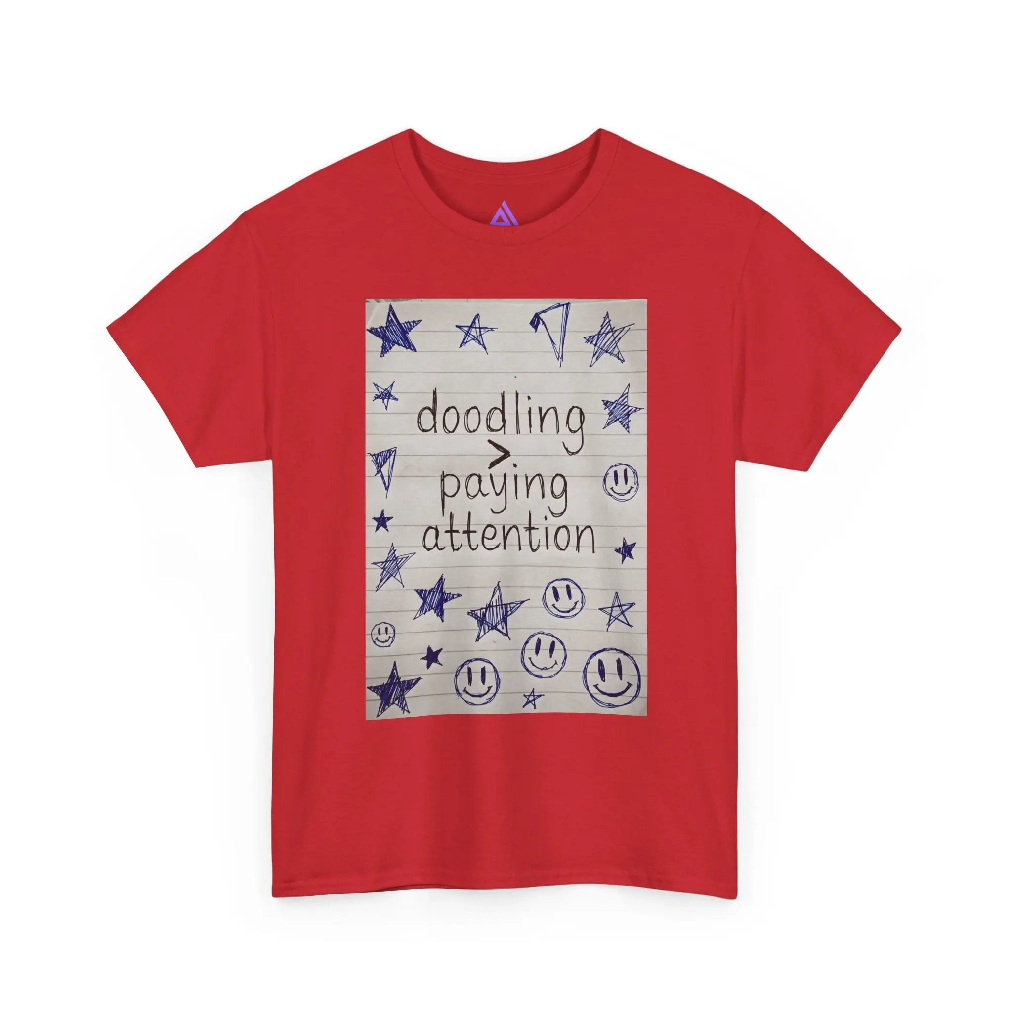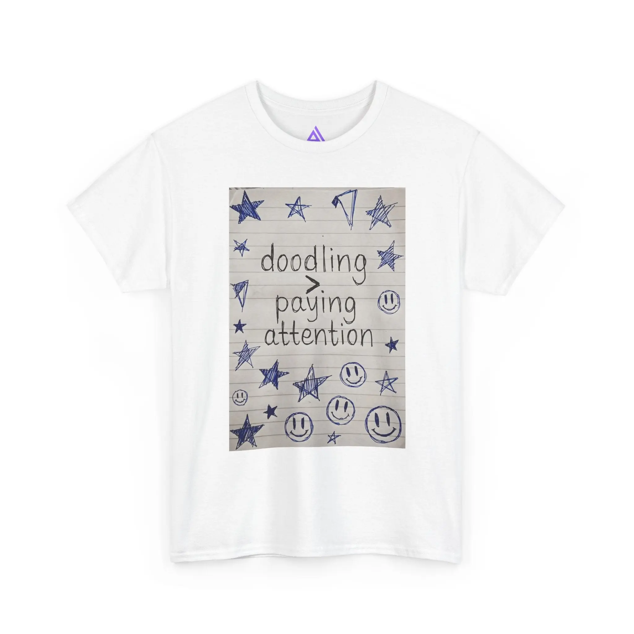 This soft, classic cotton tee carries a hand-drawn notebook-panel design that reads “doodling > paying attention,” surrounded by stars, smiley faces, and playful scribbles. It feels like slipping into a familiar sketchbook — comforting, slightly rebellious, and quietly joyful. Wear it to signal a slow, creative tempo: mornings with coffee and a pen, study breaks that turn into small bursts of inspiration, or laid-back meetups where authenticity matters more than polish. The relaxed fit and breathable cotton make it an easy layer for days spent making, sketching, or simply being present in your own offbeat way.