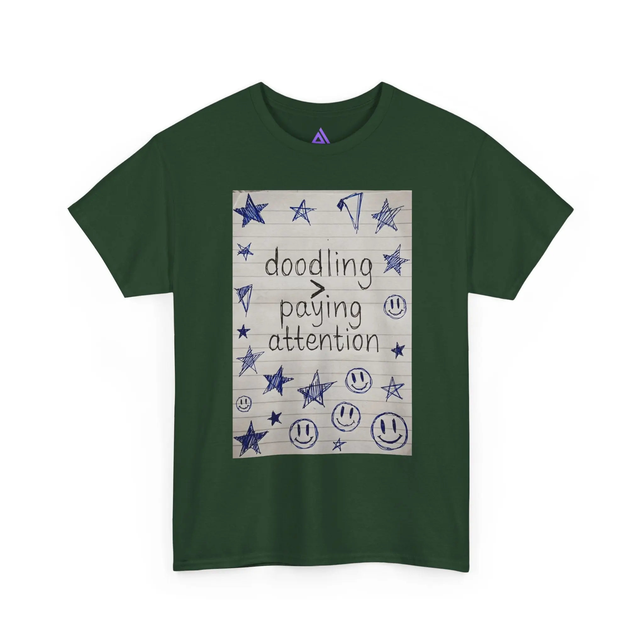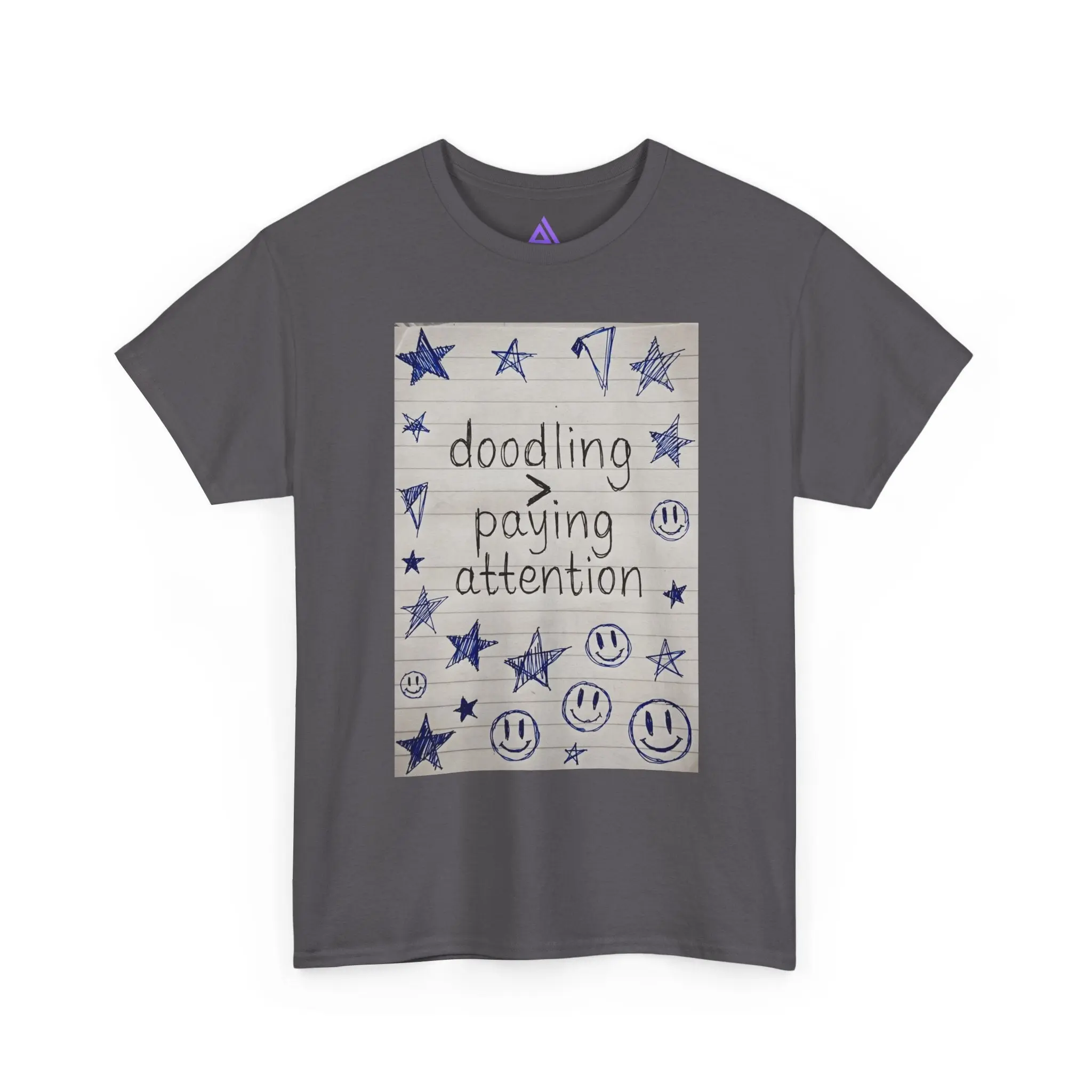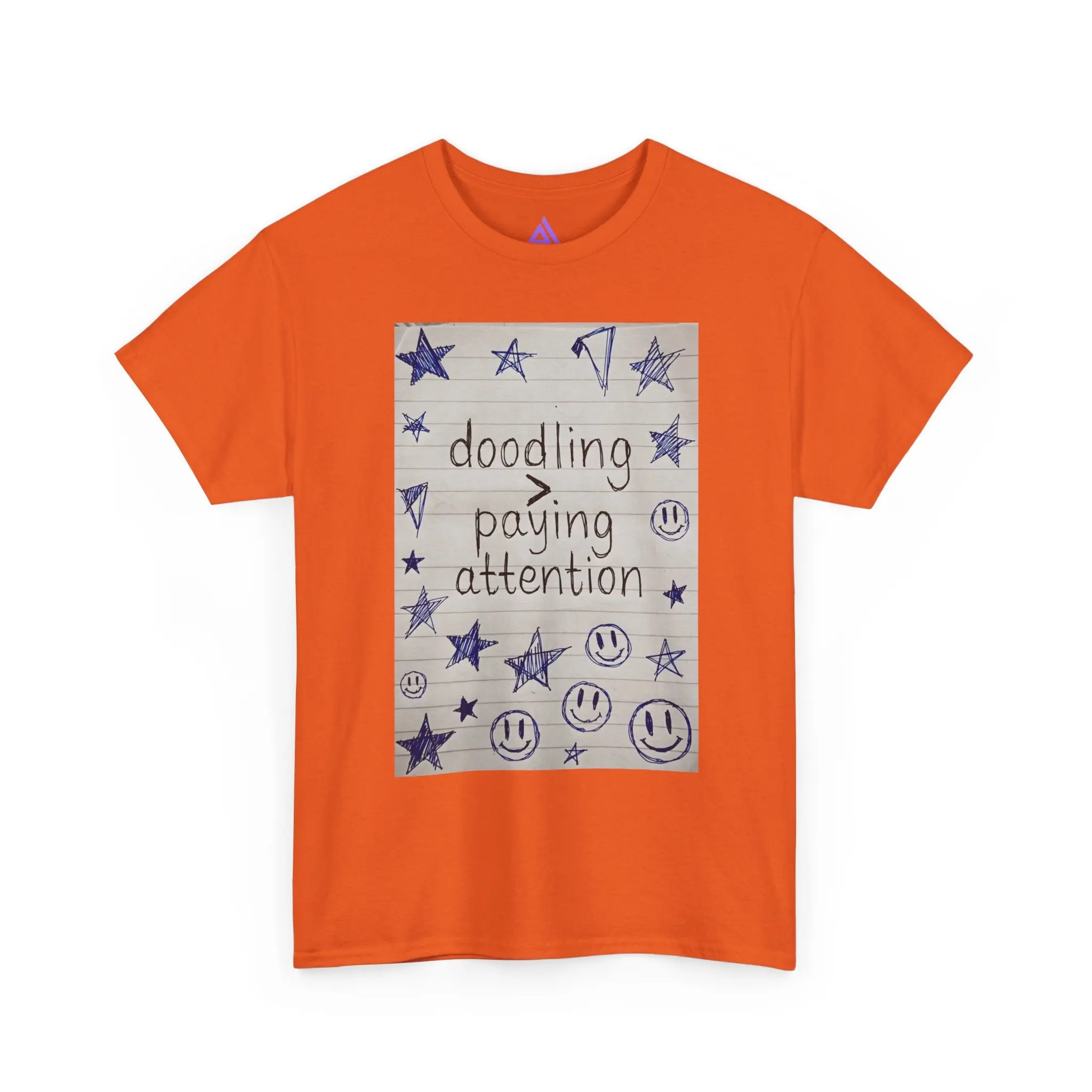 This soft, classic cotton tee carries a hand-drawn notebook-panel design that reads “doodling > paying attention,” surrounded by stars, smiley faces, and playful scribbles. It feels like slipping into a familiar sketchbook — comforting, slightly rebellious, and quietly joyful. Wear it to signal a slow, creative tempo: mornings with coffee and a pen, study breaks that turn into small bursts of inspiration, or laid-back meetups where authenticity matters more than polish. The relaxed fit and breathable cotton make it an easy layer for days spent making, sketching, or simply being present in your own offbeat way.