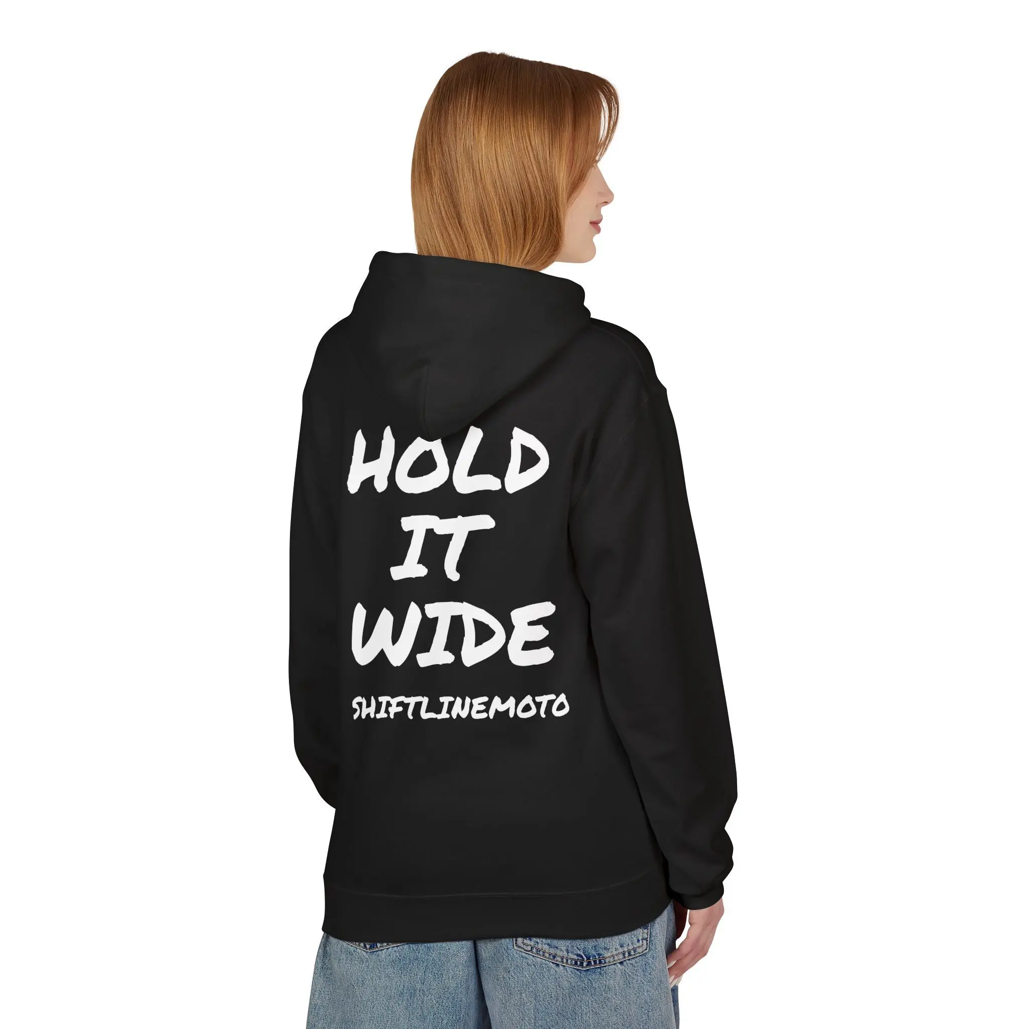 This midweight hoodie is a go-to layer for riders and gearheads who live for open roads and wide turns. The front keeps things subtle with a small tone-on-tone logo over the heart, while the back shouts the mantra “HOLD IT WIDE” in bold, brush-style lettering — a nod to cornering confidence and track-day bravado. The dropped shoulders and classic fit give a relaxed, lived-in vibe that layers easily over tees. Inside, the two-piece jersey-lined hood and roomy pouch pocket bring practical warmth on cool mornings by the garage or at the paddock. Thoughtfully made — OEKO-TEX certified fabric and socially conscious manufacturing — it’s built for people who value both performance style and responsible production.