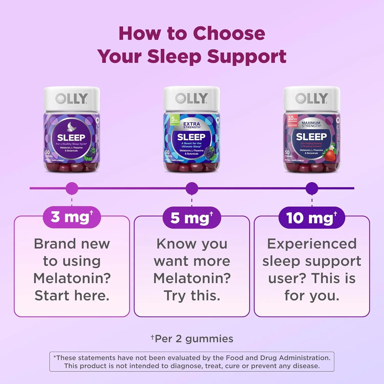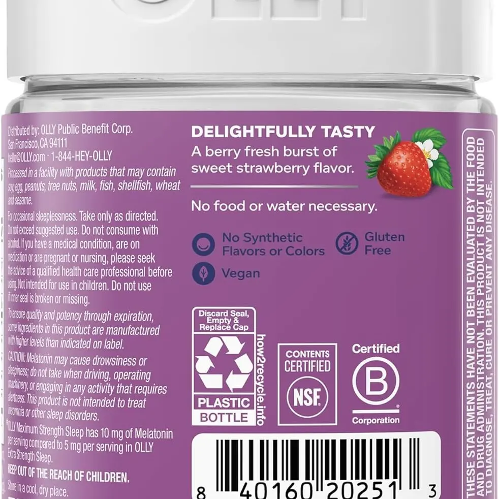 Sleep impacts our overall health—from our body to our mind. Not getting enough sleep can deal a blow to our wellness. That’s why we created sleep support supplements that do more than help you doze off. OLLY Maximum Strength Sleep is expertly formulated to help your mind unwind so you can catch your ZZZs.* The recipe for a great night’s sleep? Expert blends that support a healthy sleep cycle. L-Theanine encourages calmness so you can drift off. Melatonin, a sleepy time superstar ingredient, helps you fall asleep and stay asleep.* These gummies also have a blend of traditionally used herbal helpers: Chamomile, Passionflower & Lemon Balm Extract. Doesn’t that sound dreamy? Adults, take two gummies 30 minutes before bed, chew thoroughly before swallowing. Deliciously flavored with a burst of strawberry flavors and other natural flavors. Drug free, gluten free, sugar free, vegan and formulated with no synthetic colors or flavors. Drift off and enjoy a restful night's sleep—starting tonight.* †Circana, MULOC+, Total Gummy VMS, 52 Weeks Ending 01/26/25 *These statements have not been evaluated by the Food and Drug Administration. This product is not intended to diagnose, treat, cure or prevent any disease.