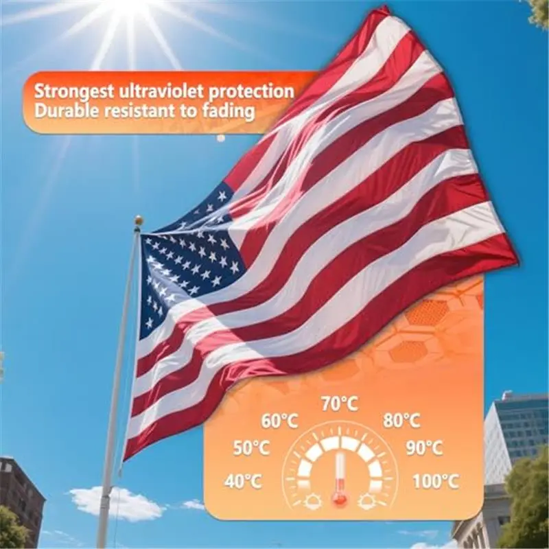 See more product details *Tired of Flimsy Flags? You’ve seen them: faded, torn flags that barely last a season.torn outdoor flags that need constant replacement. Choose our heavy-duty American flag for lasting value and dependable outdoor performance.*Our US flag is engineered to redefine durability: crafted from premium heavy-duty fabric, it’s built to wave proudly and stand up to tough outdoor conditions. Experience a USA flag that stays vibrant, strong, and intact season after season, cutting down on the frustration of frequent flag replacements due to fraying and fading.*This American flag is made of high-density, thickened, and wear-resistant material, which not only resists tearing but also improves wind resistance, increasing the durability of the American flag.*This flag is designed specifically for display in all weather conditions. Made from high-density, wear-resistant material with reinforced stitching at the edges, it can withstand sun, rain, and wind while maintaining its vibrant colors and durability.*This durable American flag features reinforced stitching, tear-resistant fabric, and sturdy brass grommets, allowing it to withstand strong winds without tearing or fraying. Just avoid using it in extreme storms like hurricanes.*This American flag is a high-quality embroidered version, and the star pattern is actually hand-stitched, resulting in a beautiful, textured effect. The embroidered stars are full and three-dimensional, and the red and white stripes are neatly and securely sewn, making the American flag more durable and extending its lifespan.*American flag is waterproof and sun-resistant. Made from high-strength, durable materials, it is waterproof, UV-resistant, windproof, and fade-resistant, able to withstand any harsh weather conditions.*The flag features a specially designed, thickened and reinforced brass grommet on the side, compatible with most standard flagpoles on the market. The grommet edges are double-stitched for added durability, preventing tearing when hung and ensuring it won't easily detach in windy conditions. Installation is incredibly easy!*This durable American flag is perfect for every holiday! It's ideal for displaying on Independence Day, Memorial Day, Veterans Day, and Flag Day to show your national pride.*The American flag does not include a flagpole. The American flag comes with two brass grommets, making it easy to hang for long-term outdoor display or indoor decoration.*American flag gentle hand washing in cold water and air drying is the best way to preserve the appearance of the .*This embroidered American flag comes with a 150-day from the date of purchase.We are confident in our quality, and if there are any problems, please for a replacement flag, and we will handle it quickly.