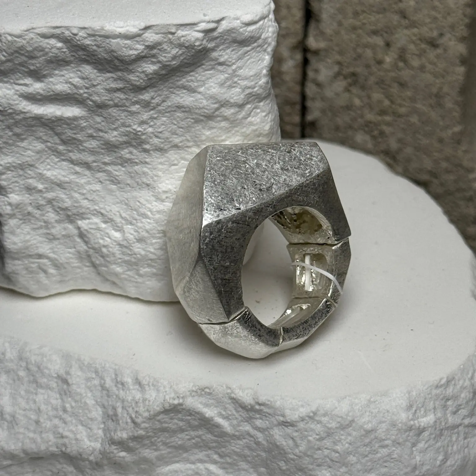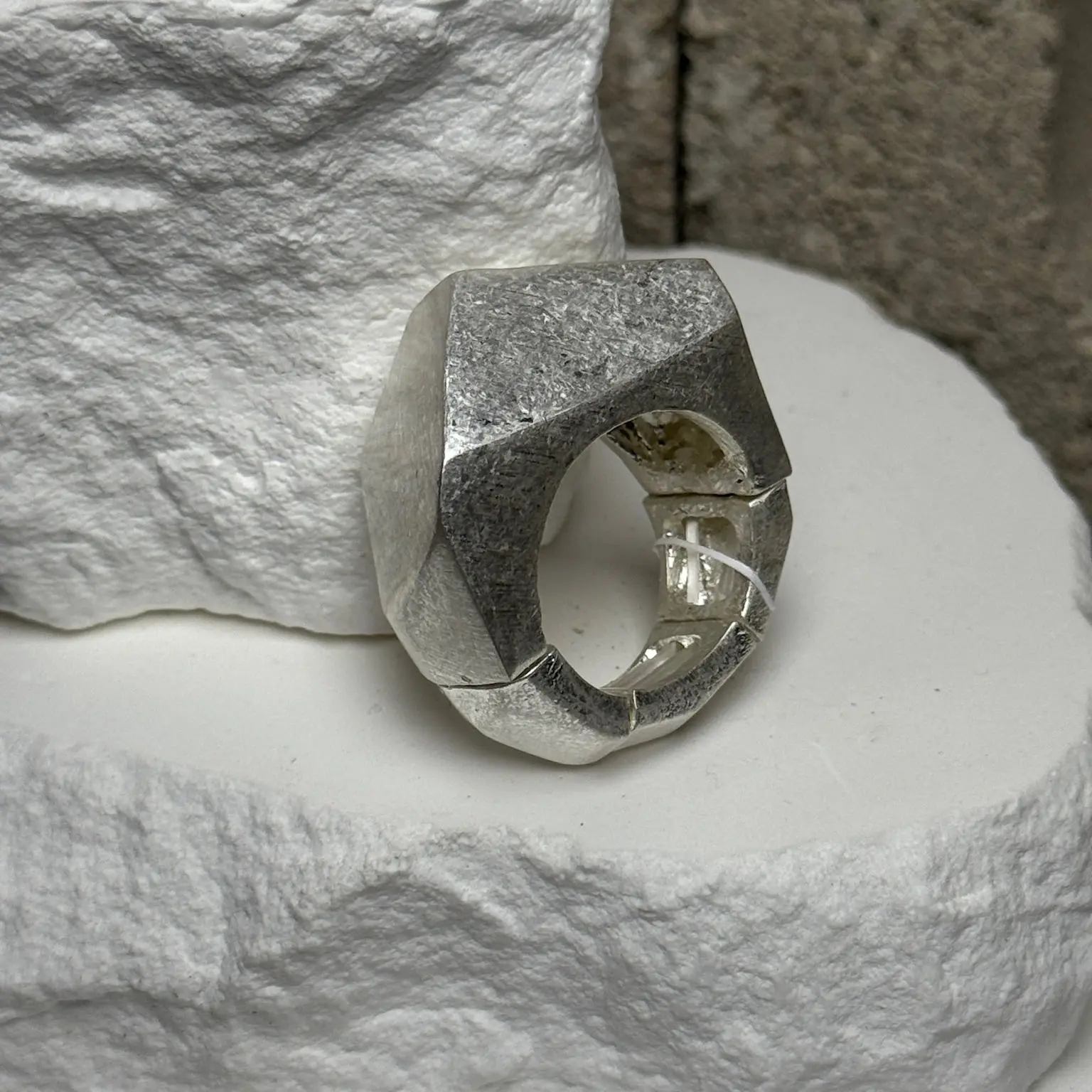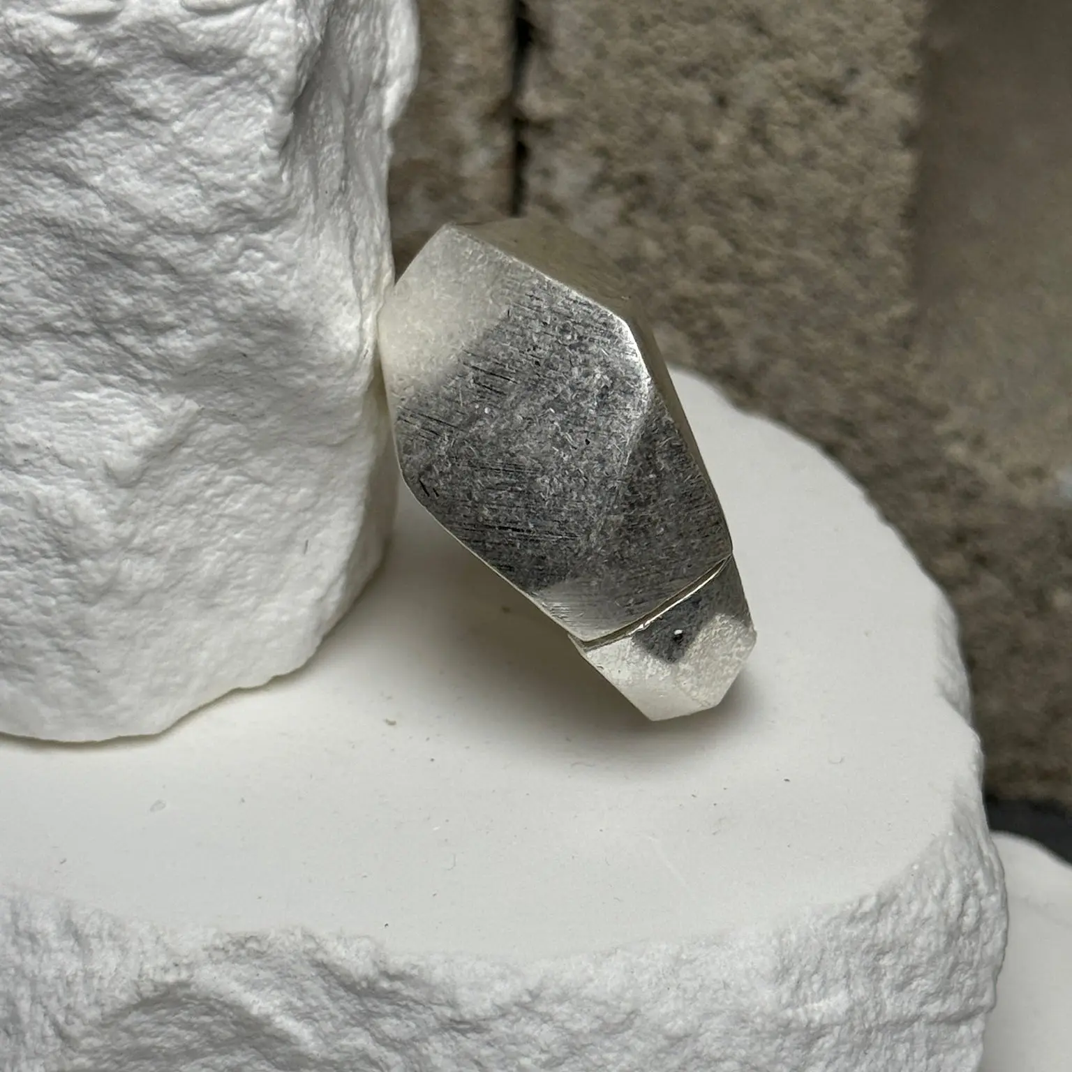 Designed to feel both modern and timeless, its faceted surface creates dimension from every angle, while the smooth, satin-like texture adds a refined, almost velvety touch. Available in both a cool silver tone and a warm gold finish, it’s the kind of ring that instantly elevates your everyday look while still holding its own as a statement piece.