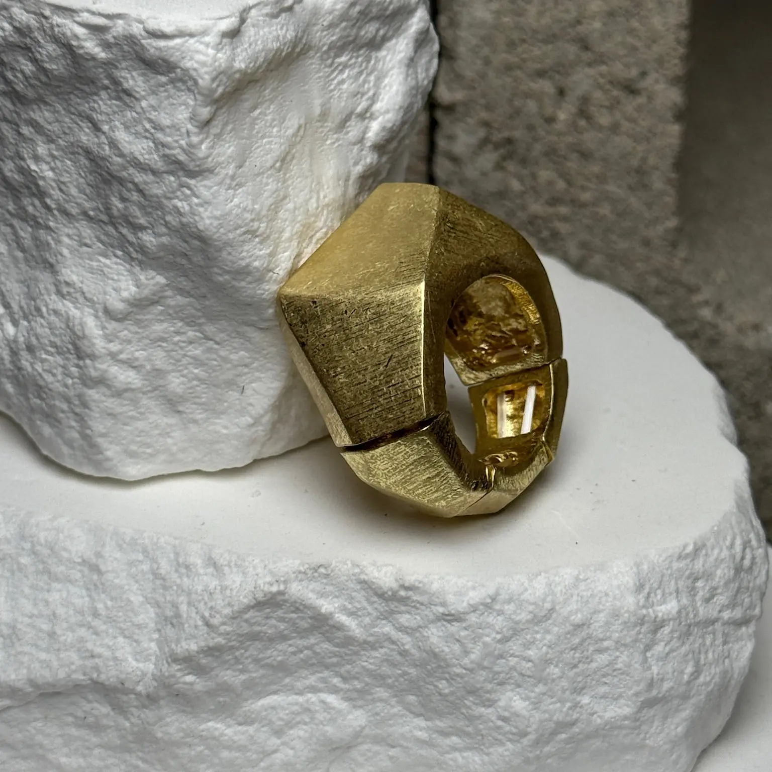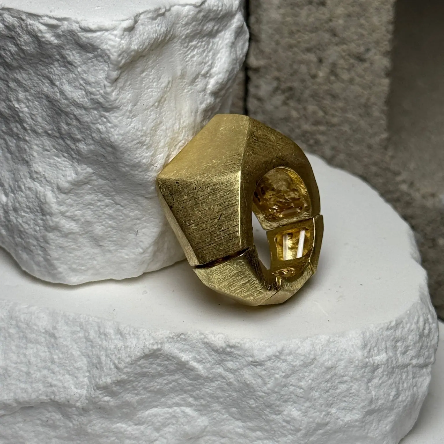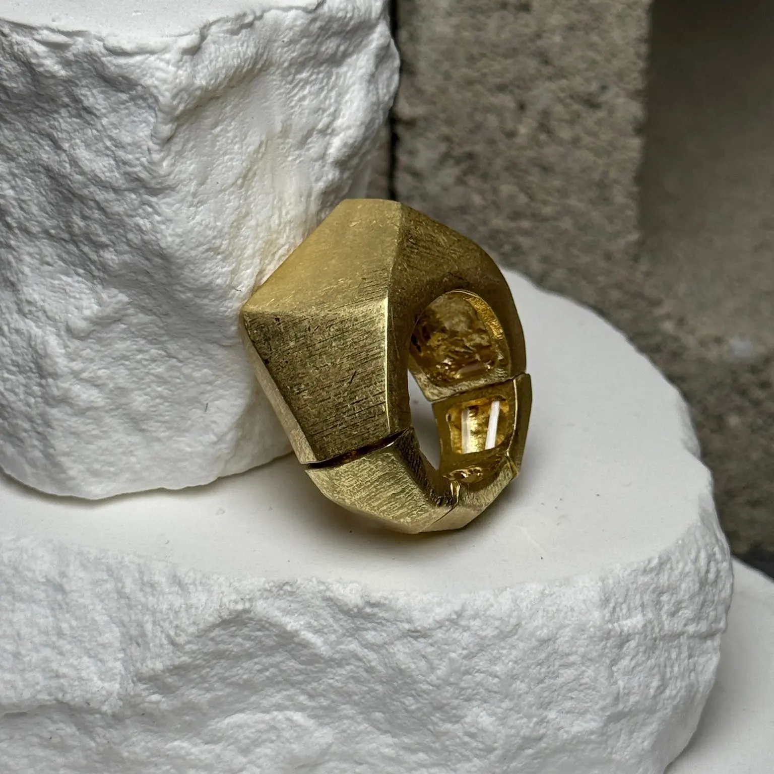 Designed to feel both modern and timeless, its faceted surface creates dimension from every angle, while the smooth, satin-like texture adds a refined, almost velvety touch. Available in both a cool silver tone and a warm gold finish, it’s the kind of ring that instantly elevates your everyday look while still holding its own as a statement piece.
