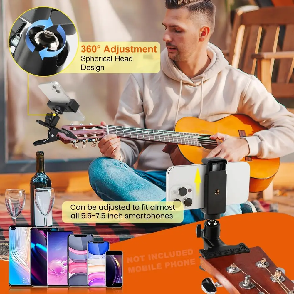 ·1. Flexible Installation: The guitar playing phone stand adopts a clamping design, with a maximum clamping thickness of up to 2.95 inches. The guitar phone stand is suitable for clamping on the guitar head/bass/ukulele/table/pole or other places, without the need for drilling or tools, and is easy to use.