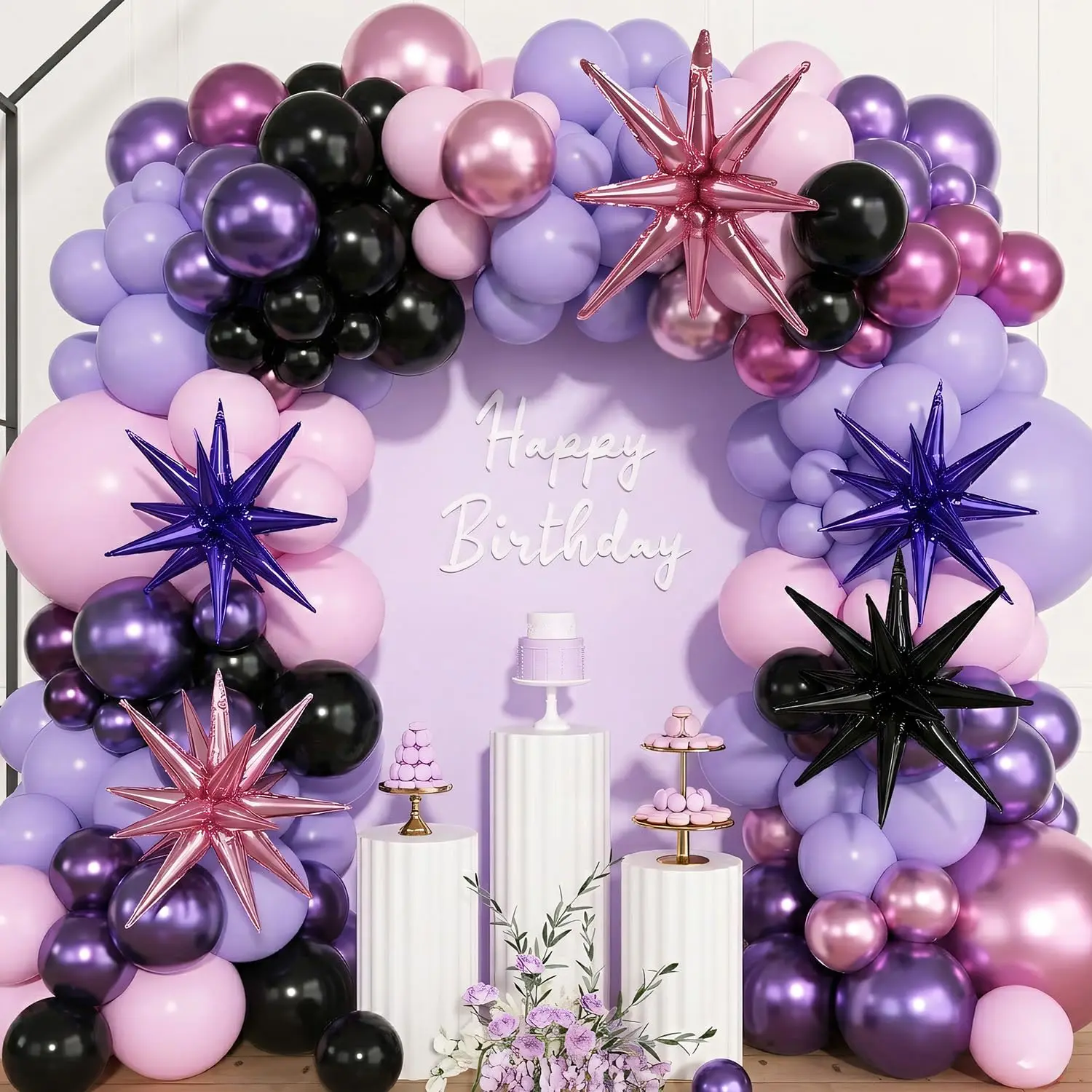 118 PCS Pink, Purple & Black Balloon Arch Kit with Star Foil Balloons for Girls' Birthday & Party