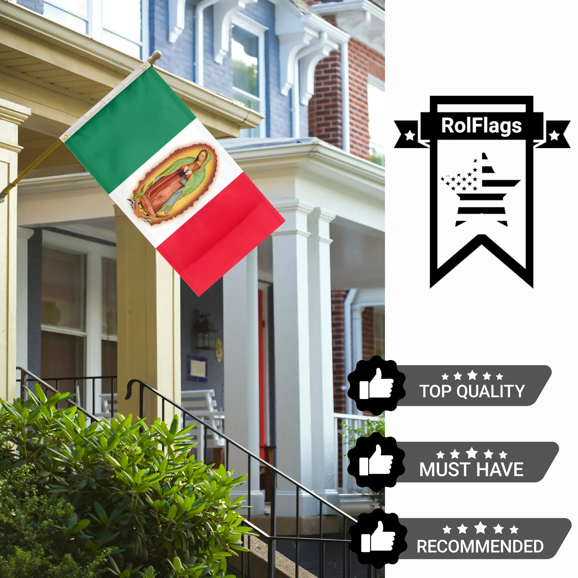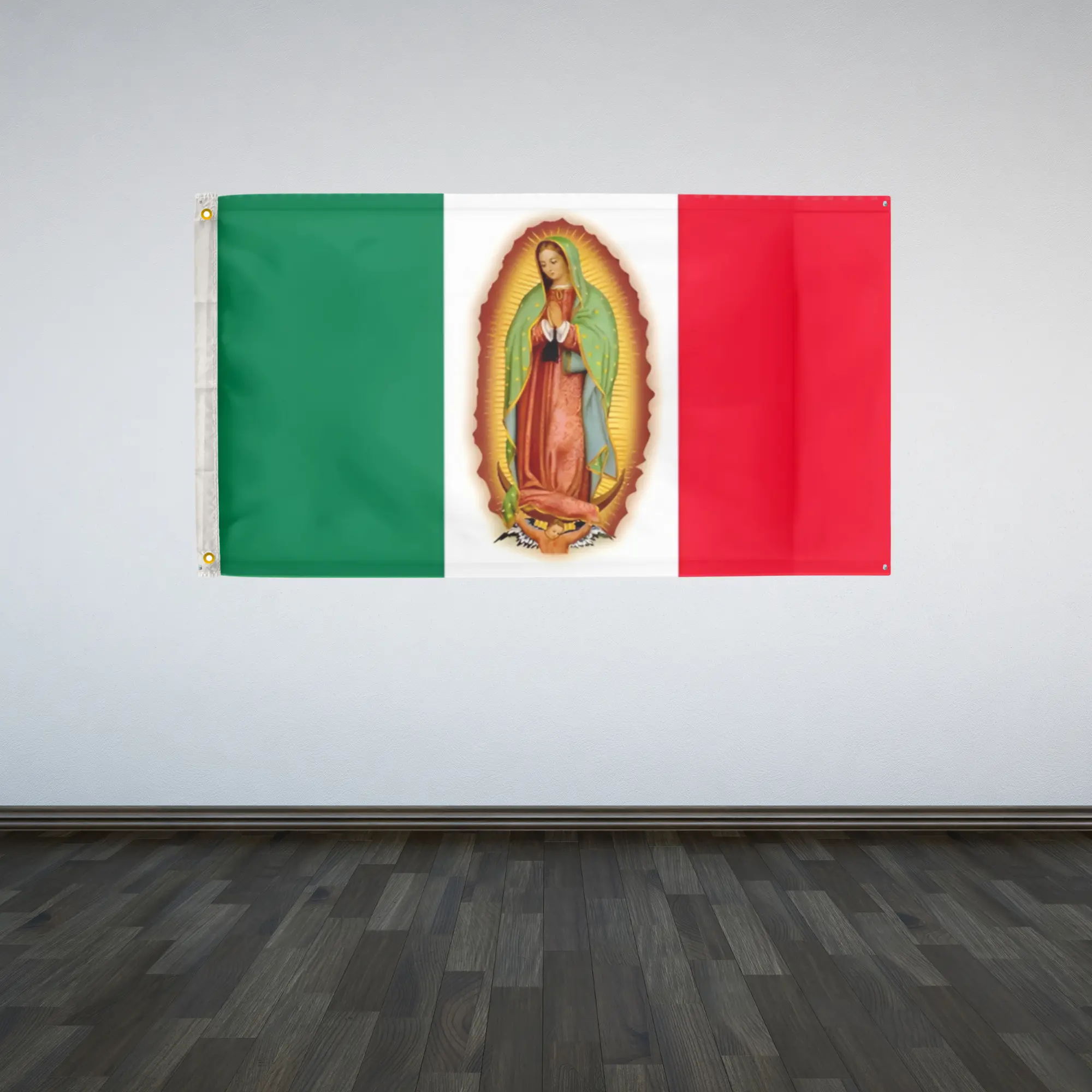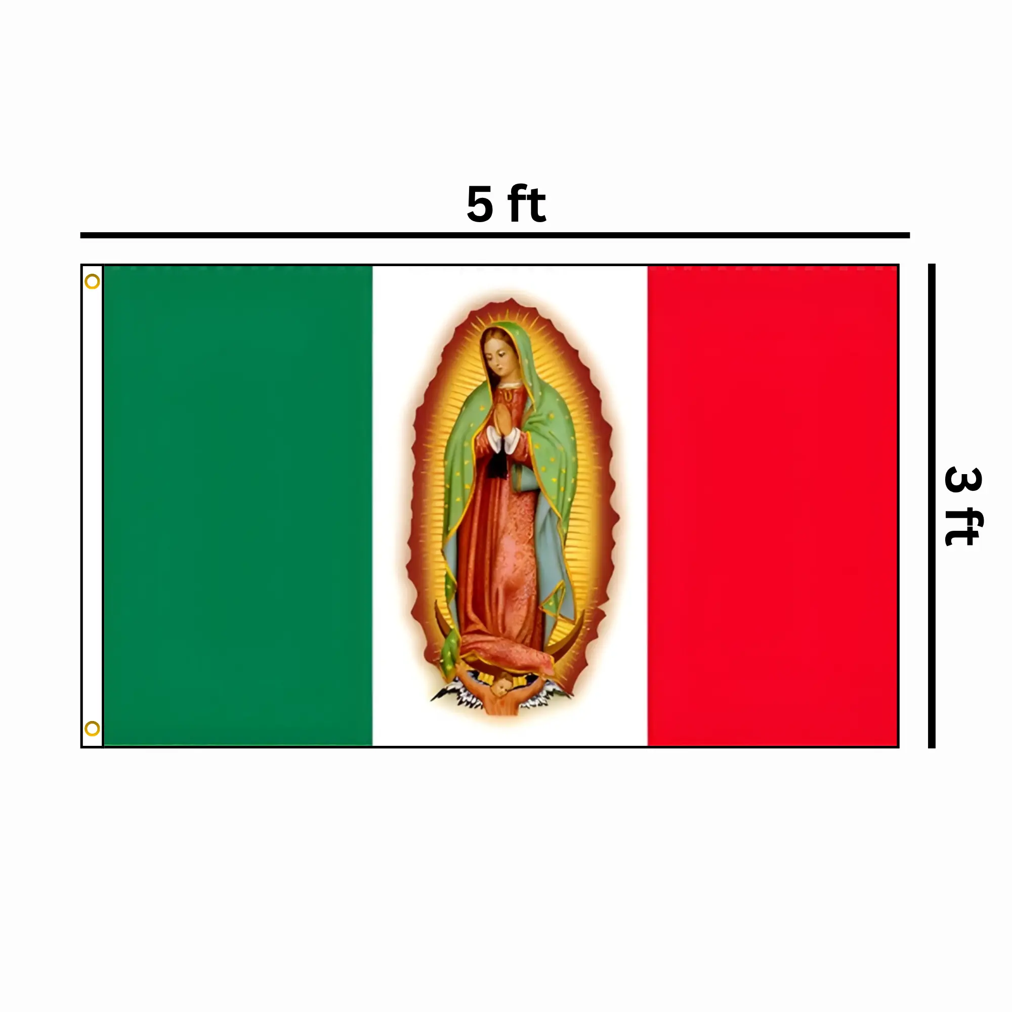 Show your faith and patriotism with the Mexican Virgen De Guadalupe Flag by RolFlags. Measuring 3' x 5' (90cm x 150cm) and crafted from durable 100D polyester, this flag is designed for both indoor and outdoor display. Featuring a bold Catholic-themed design alongside classic Mexican symbolism, it’s perfect for homes, churches, events, or gatherings. Lightweight yet sturdy, it flies beautifully in the breeze while standing up to everyday use.