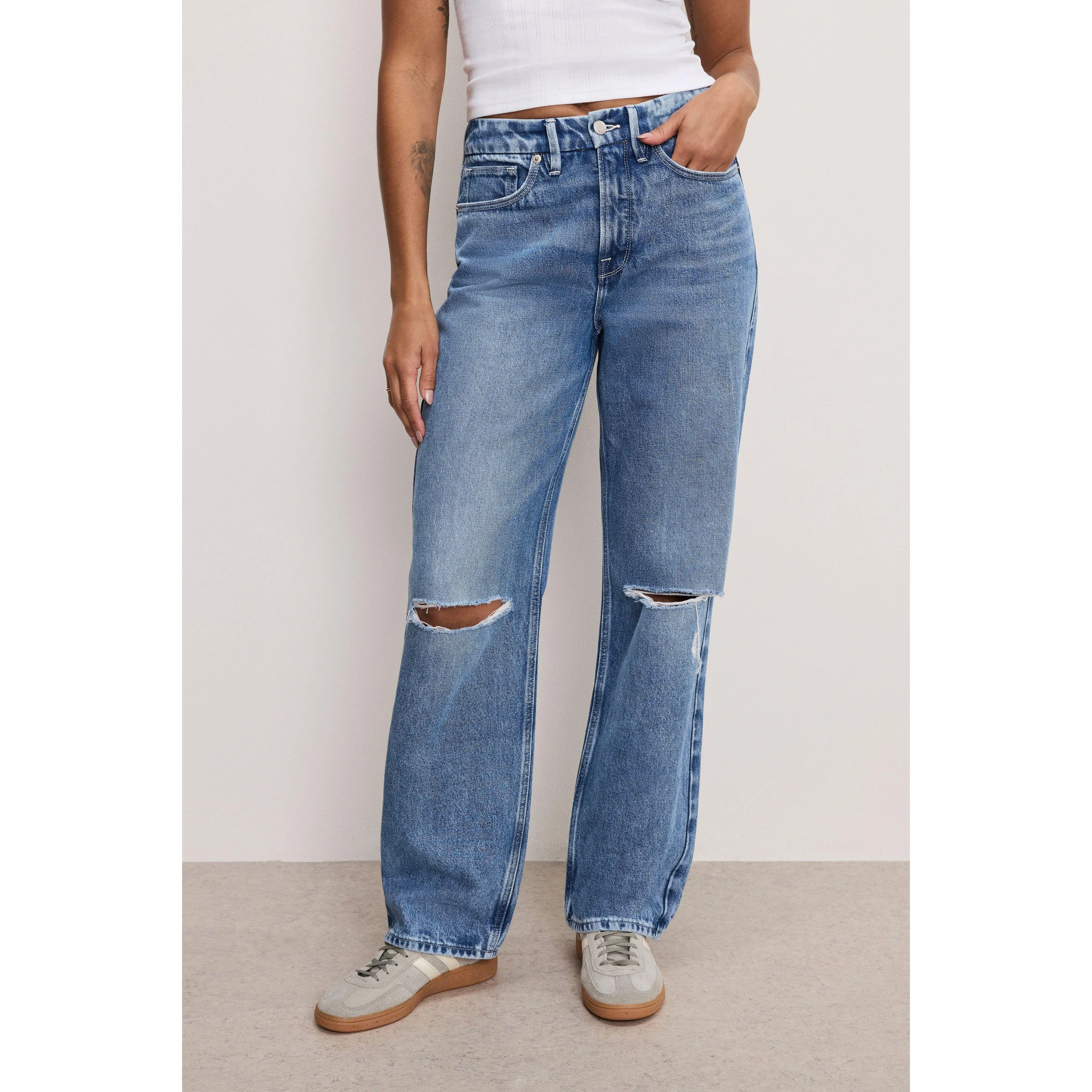 Iconic ‘90s inspired relaxed jeans with a mid-rise waist, dropped crotch, slits at knee and relaxed legs.