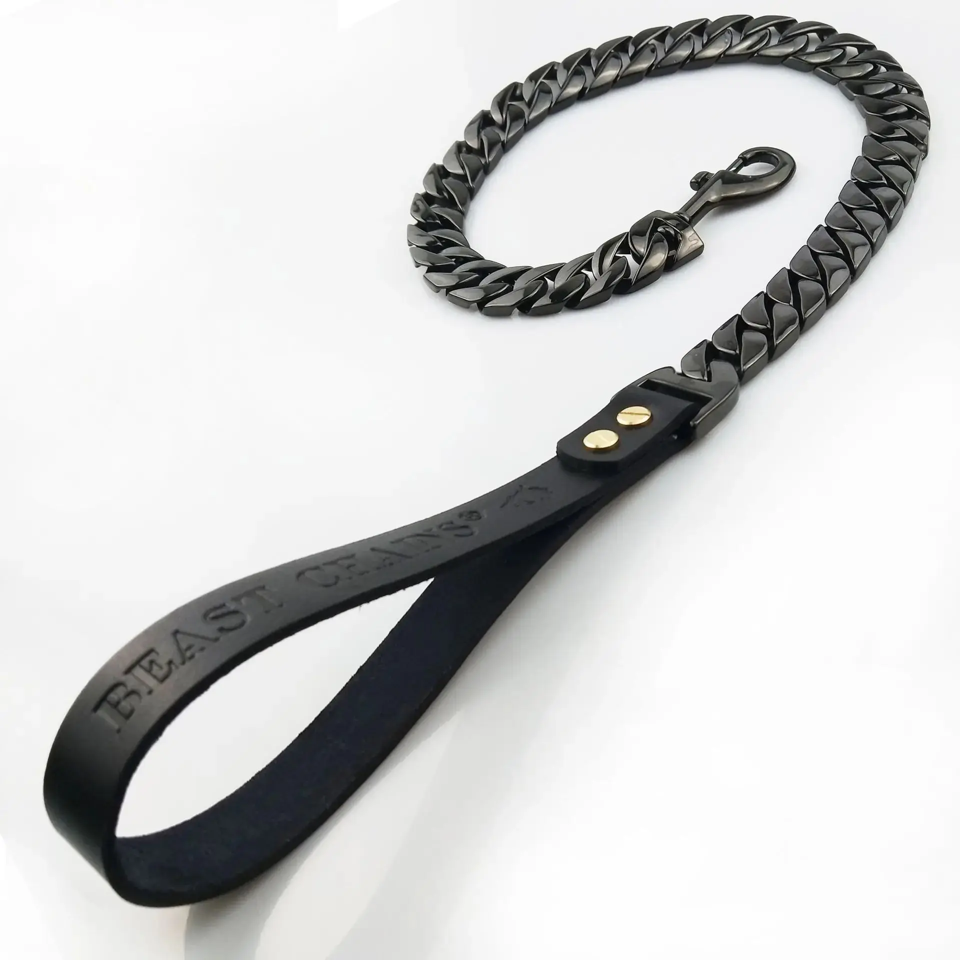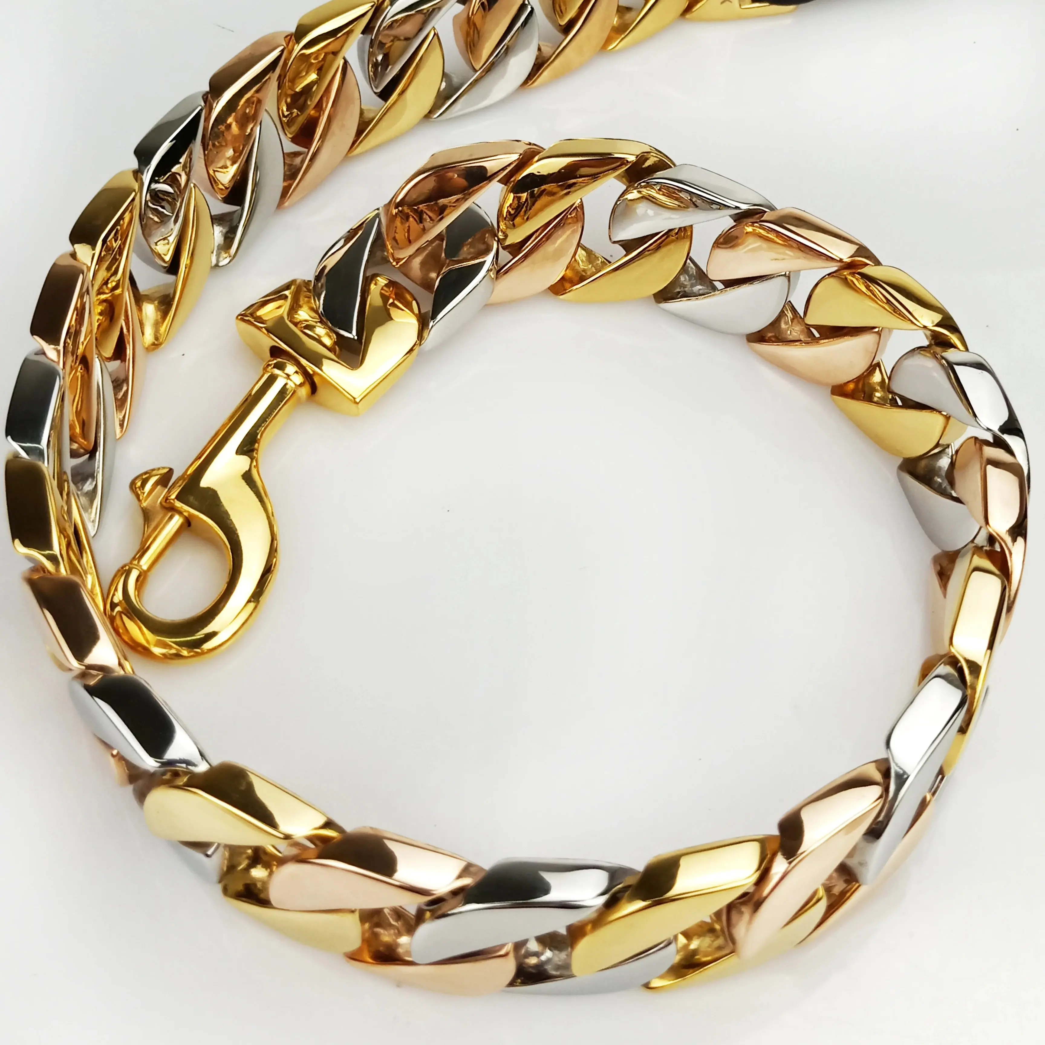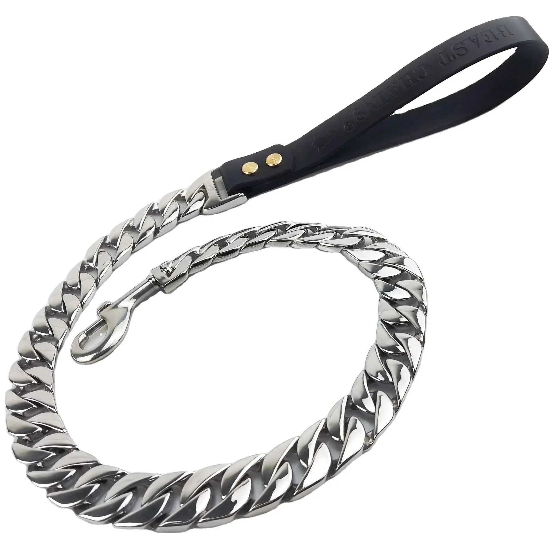 The Manufacturers Pet Leather Handle Stainless Steel Leashes Gold Cuban Chain Dog Harness is designed for durability and strength. The stainless steel construction ensures longevity, while the leather handle provides a comfortable grip. This harness is suitable for large dogs, offering reliable control during walks and outdoor activities.