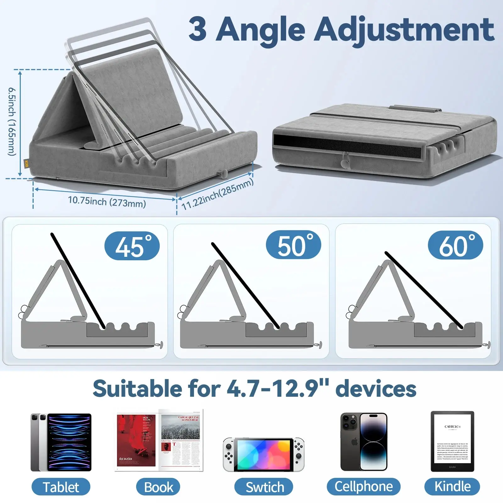 The iPad pillow holder for tablet is suitable for all 4-13" tablet and other devices, such as compatible for iPad 9.7 inch, iPad 10.2" 2019, iPad Pro 12.9", iPad mini 2 3 4 5 Wi-Fi, iPad Air 2, iPhone 15 14 13 12 11 Pro Max , iPhone 11, Surface Pro, Galaxy Tab S8, S7, A8, A7, Switch, books and more.