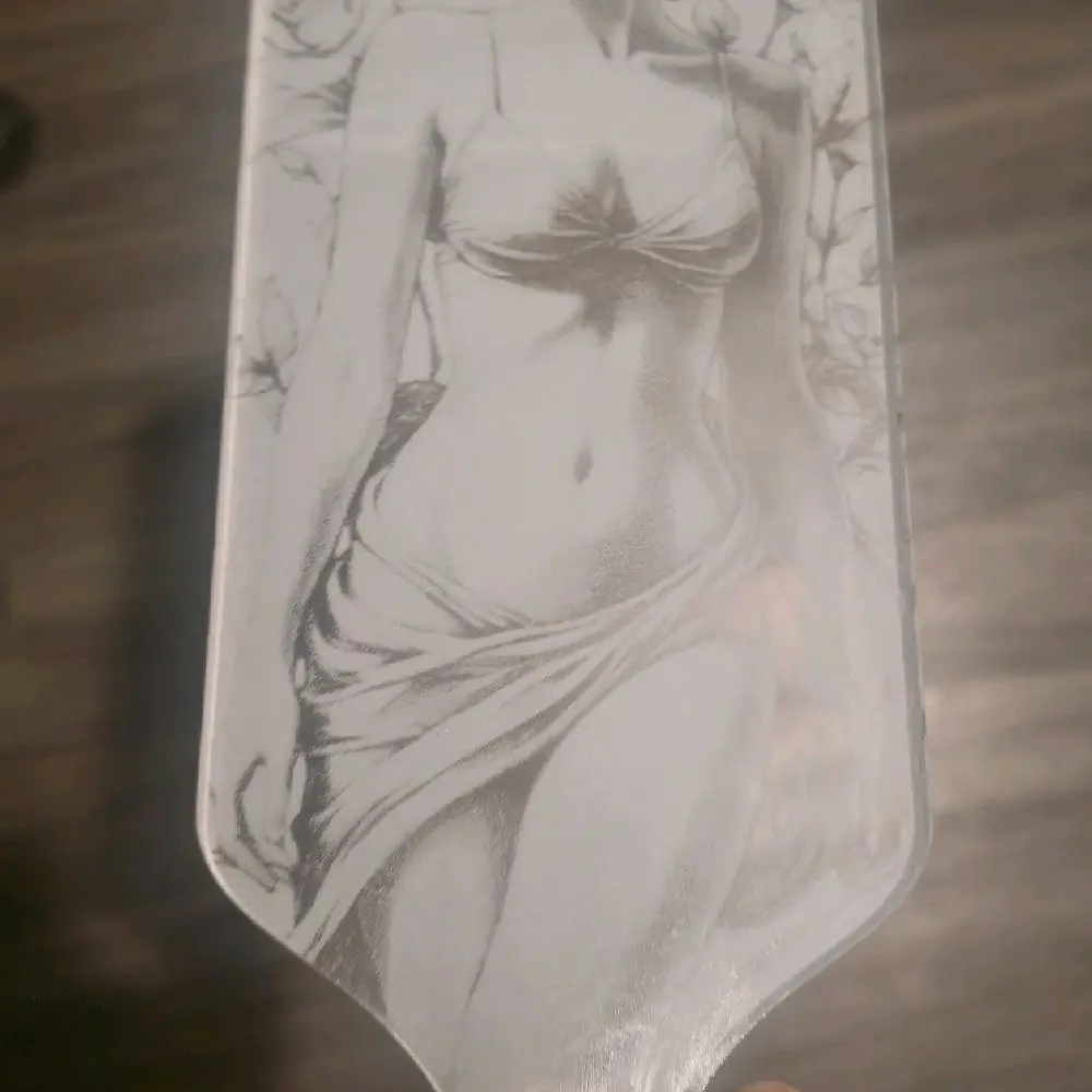 Hold up this crystal-clear paddle and watch the light dance over a beautifully engraved muse — that elegant, beauty surrounded by roses is serving pure sinful elegance.