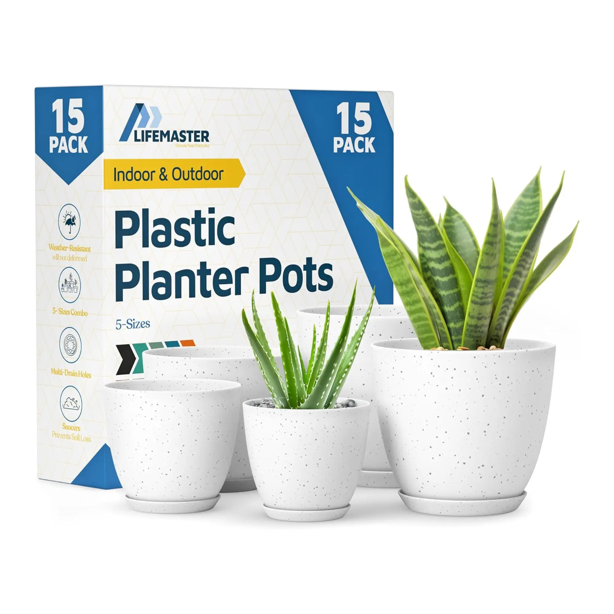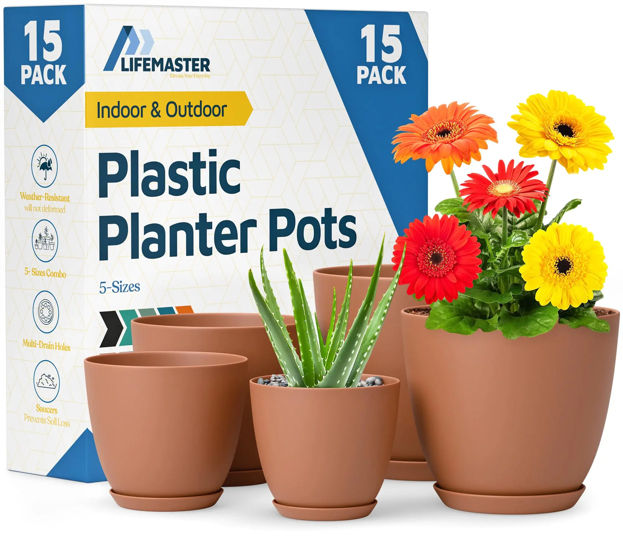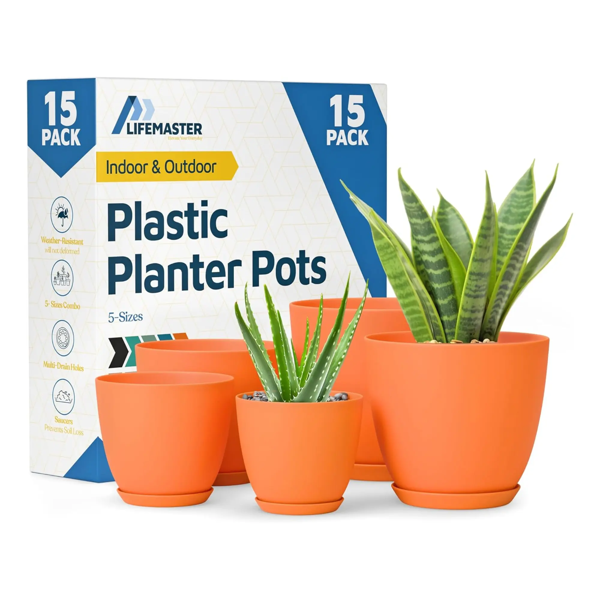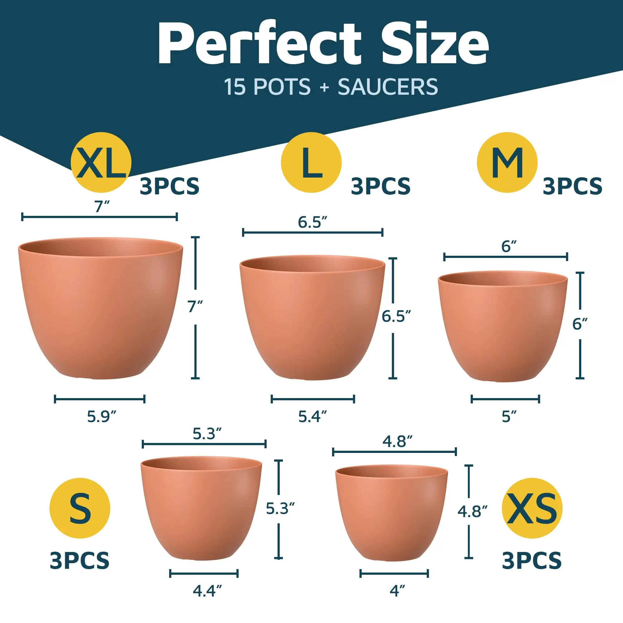 Plant Pots with Drainage Holes & Saucers 15 Pack, Indoor & Outdoor Stackable Space-Saving Planters for Houseplants & Flowers, (7", 6.7", 6", 5.3", and 4.8" Inches), Durable & Weatherproof
