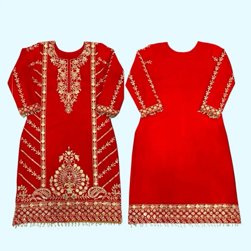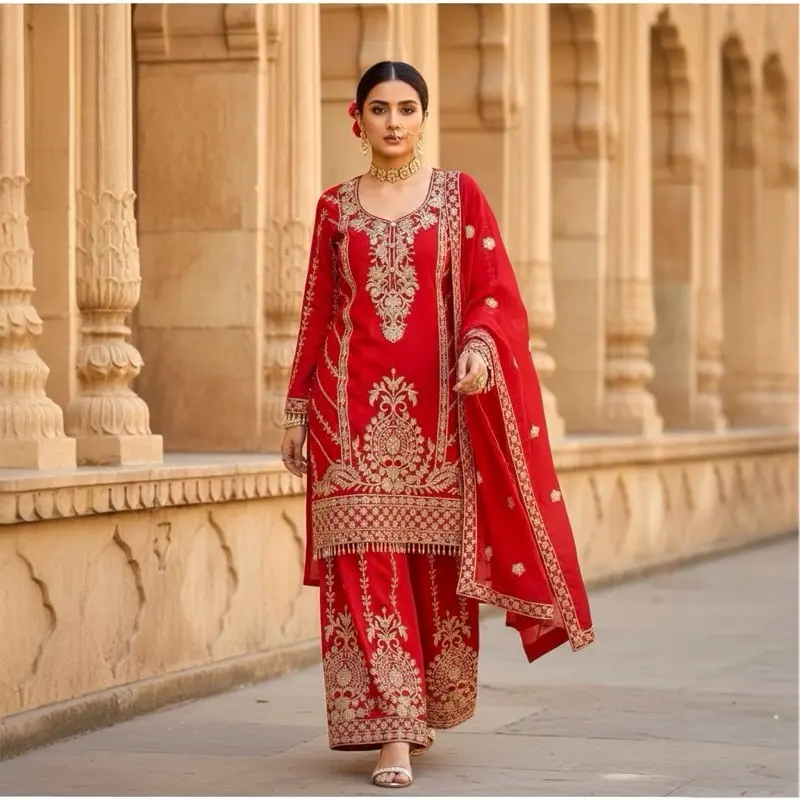 ✨ This Sharara set is versatile, suitable for various party themes. The bold red hue ensures you remain the center of attention. Pair it with your favorite accessories to complete the look. Ideal for those seeking a striking and memorable party outfit.