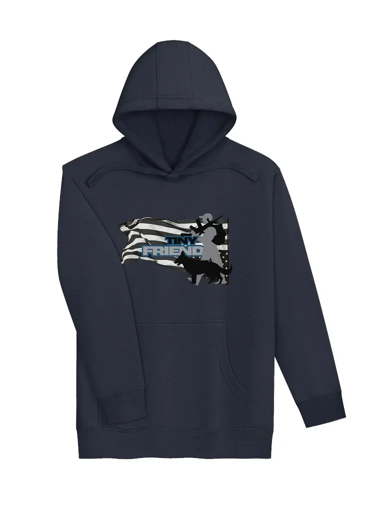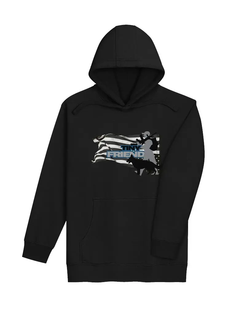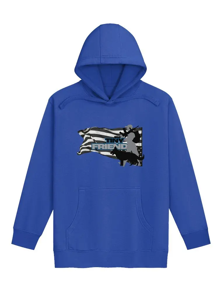 Wrap yourself in comfort and style with the Tinyfriend Flag Hoodie. Made from a soft cotton blend, this heavyweight hoodie features a striking black and white flag design with silhouetted figures. Unisex sizing and a regular fit make it a versatile addition to your wardrobe.
