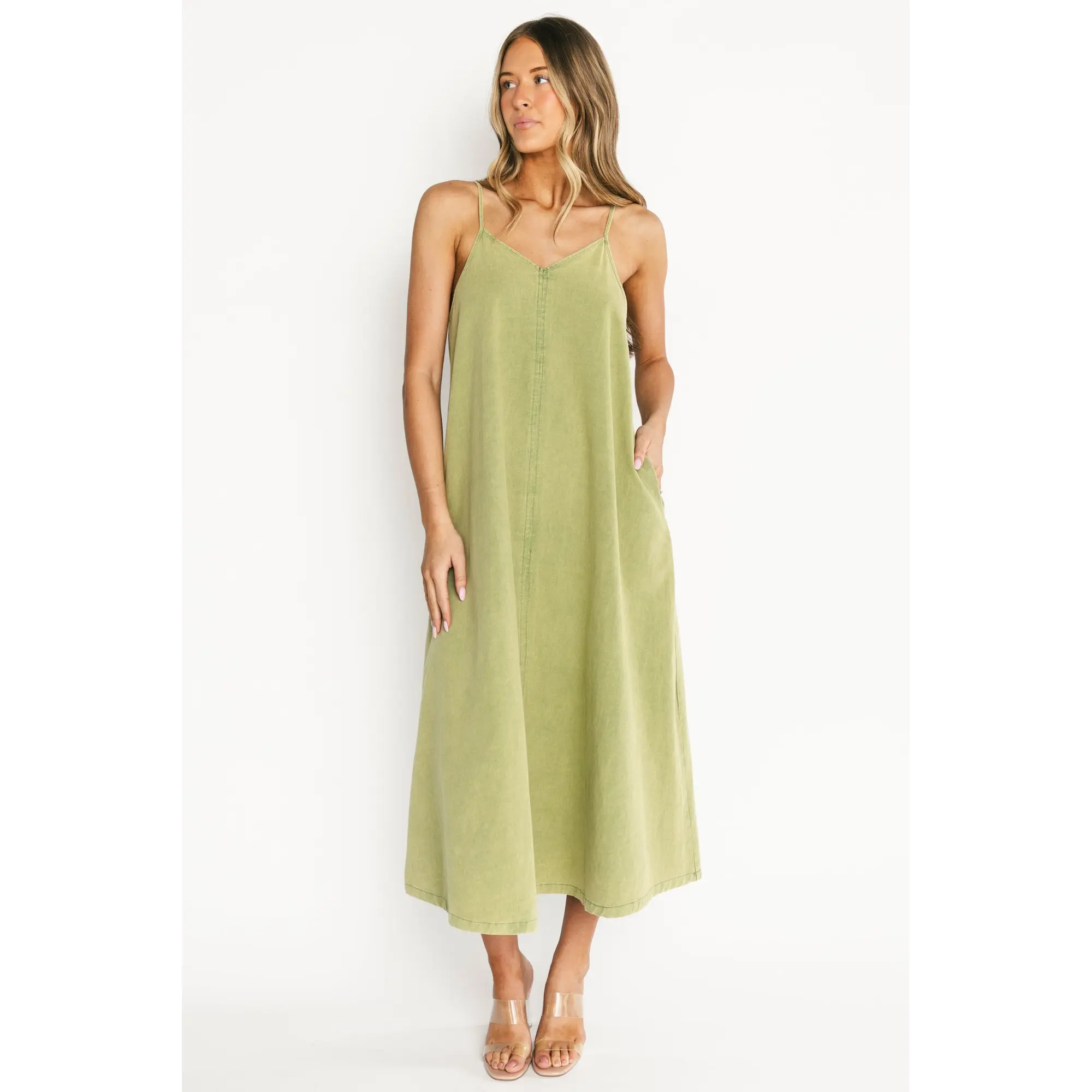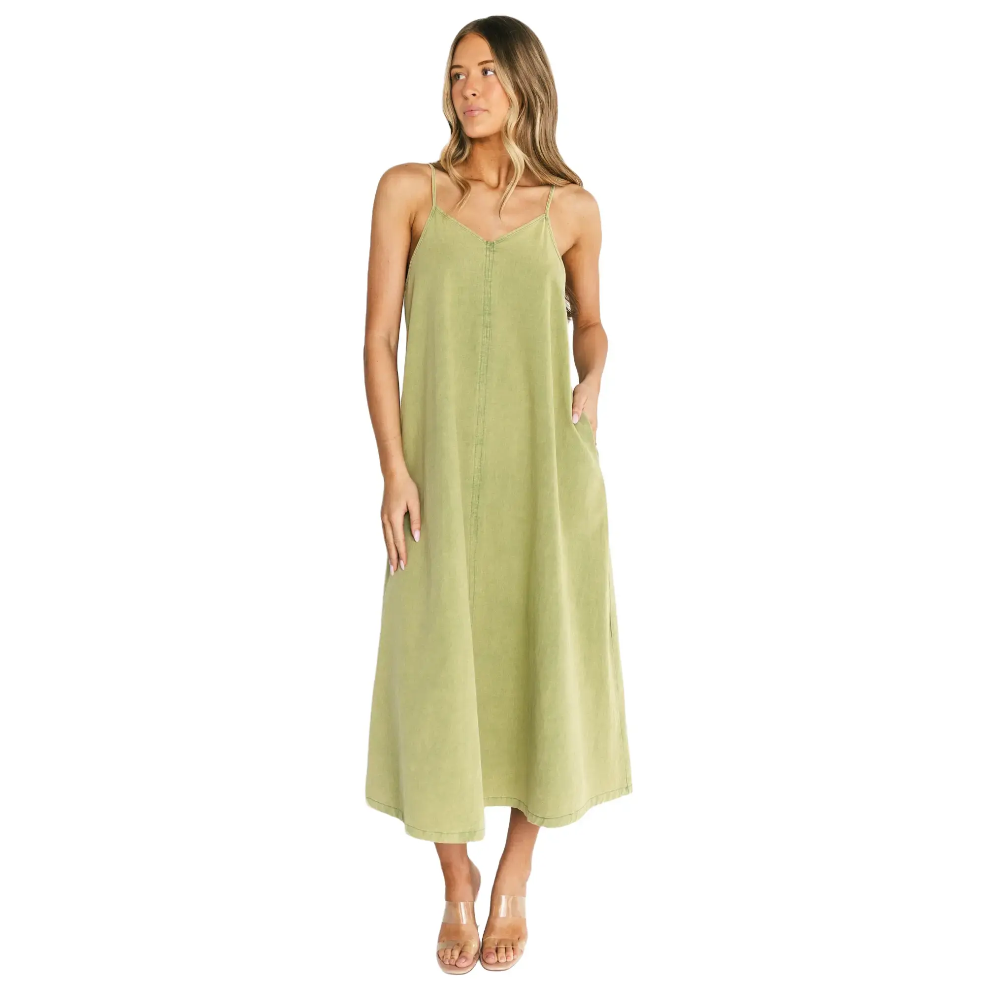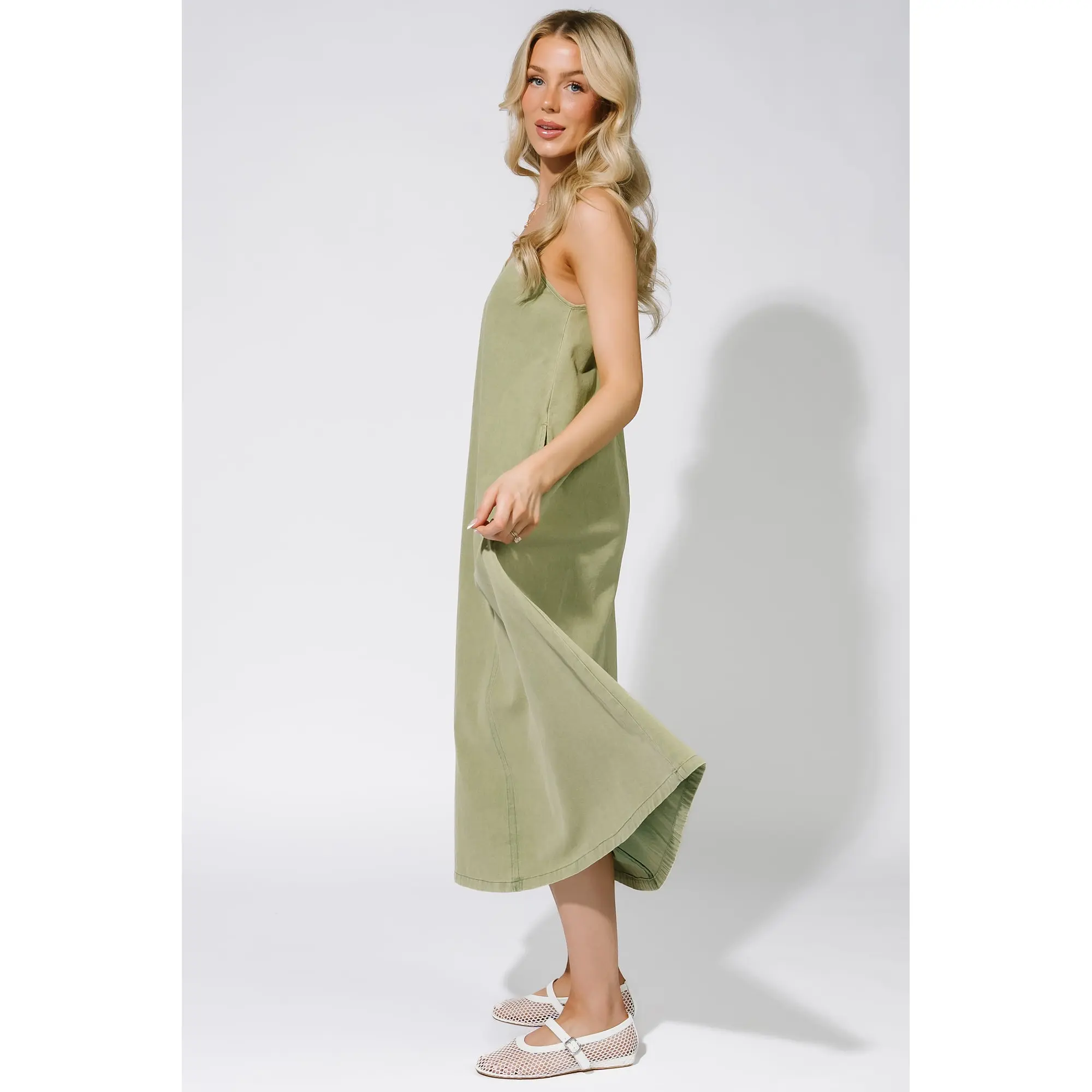 The Marcia Maxi Dress is a relaxed, straight-fit maxi cut in a green wash lightweight cotton that feels like soft denim. Designed for easy everyday wear, it balances simple lines with practical details so you can move comfortably from brunch to market runs.