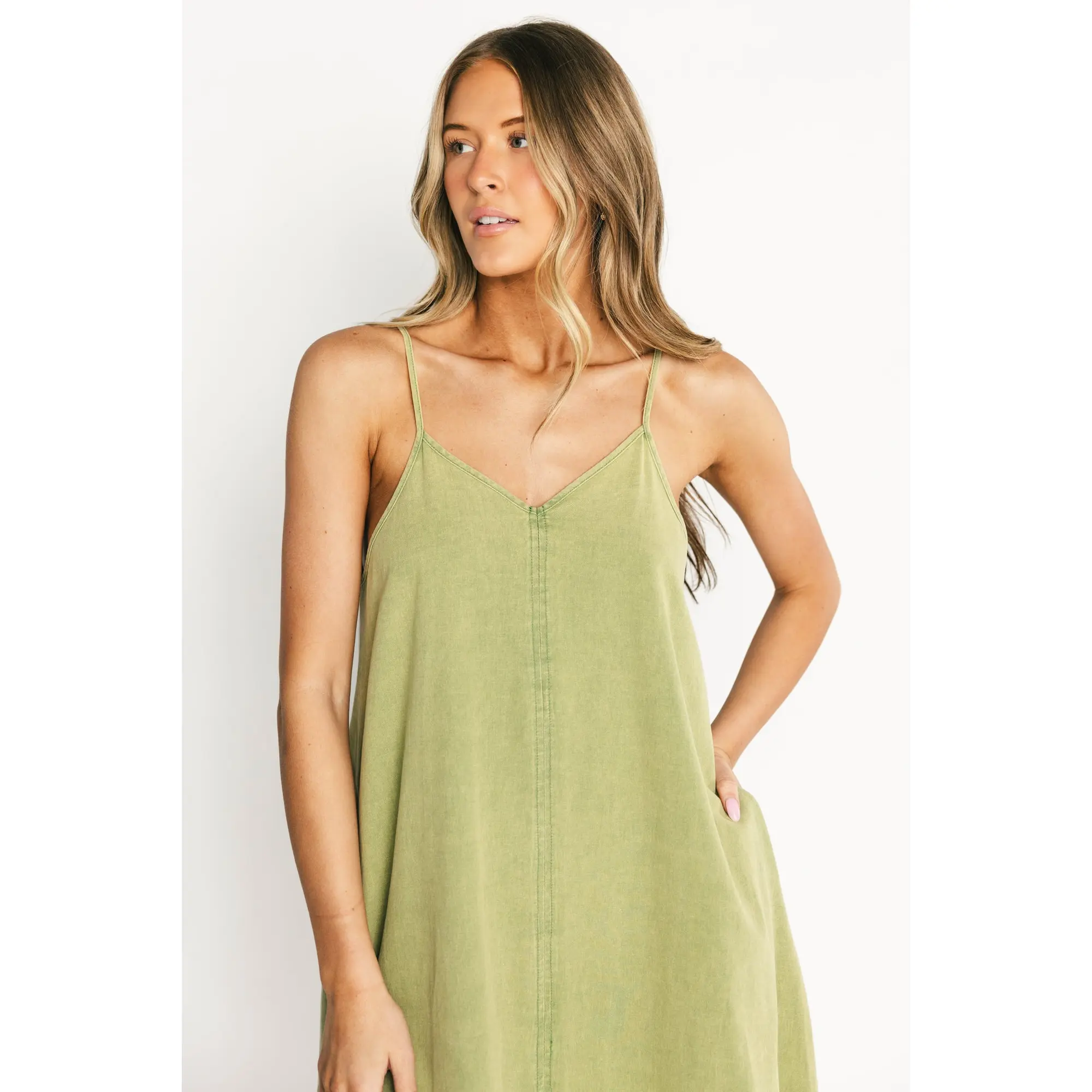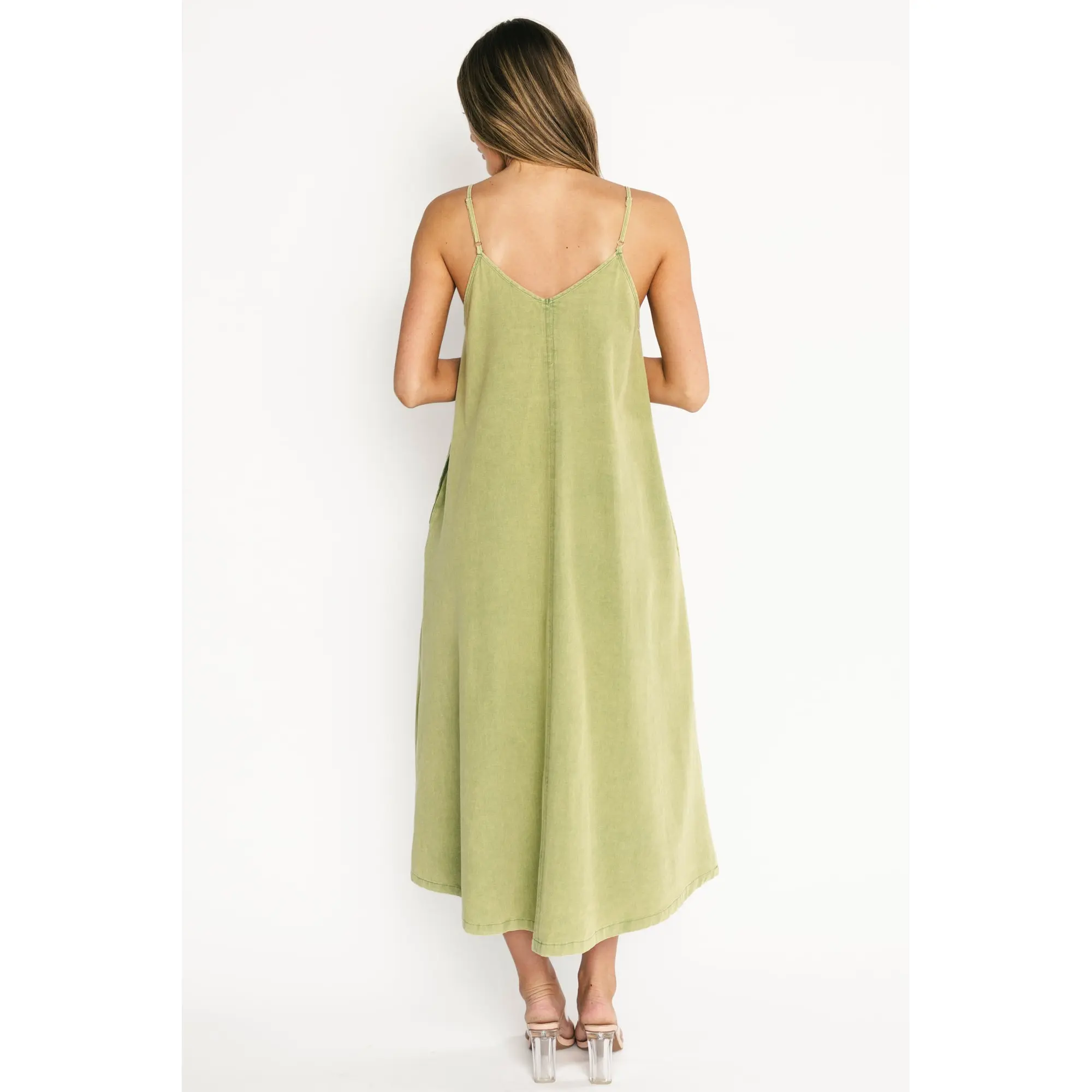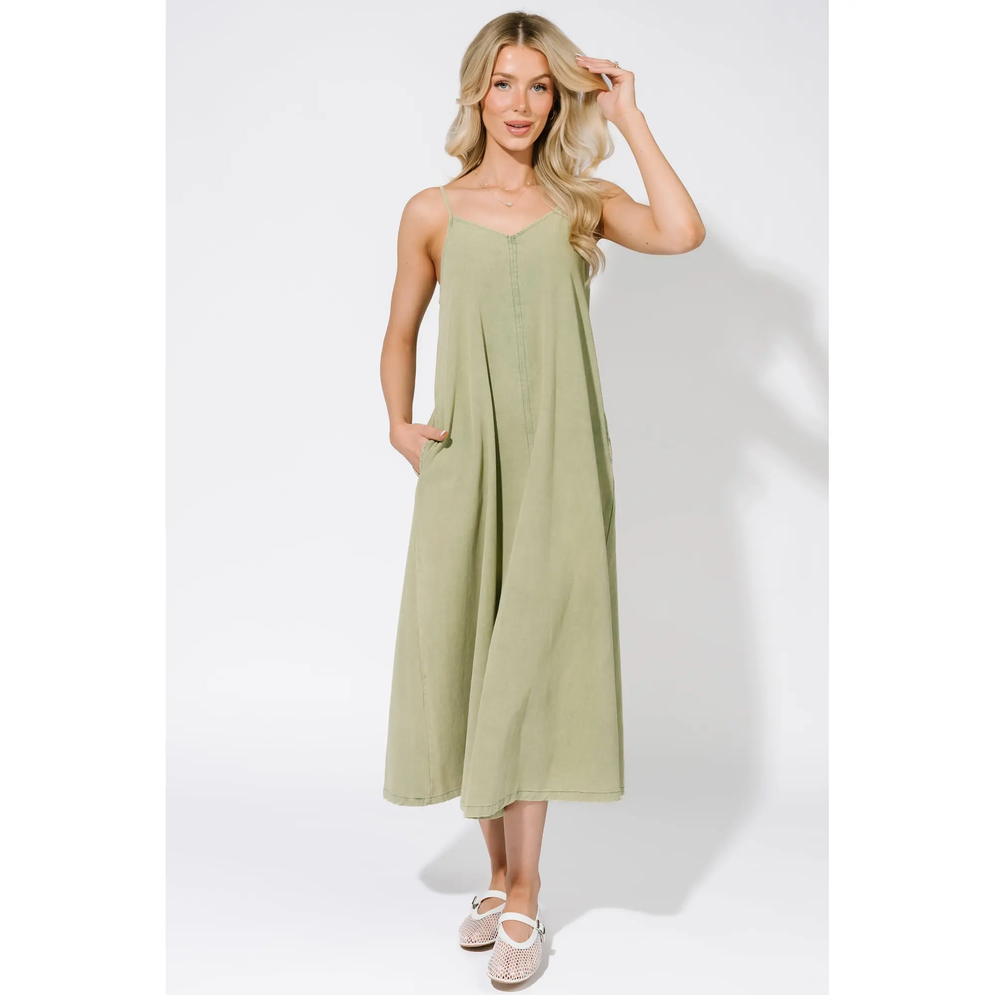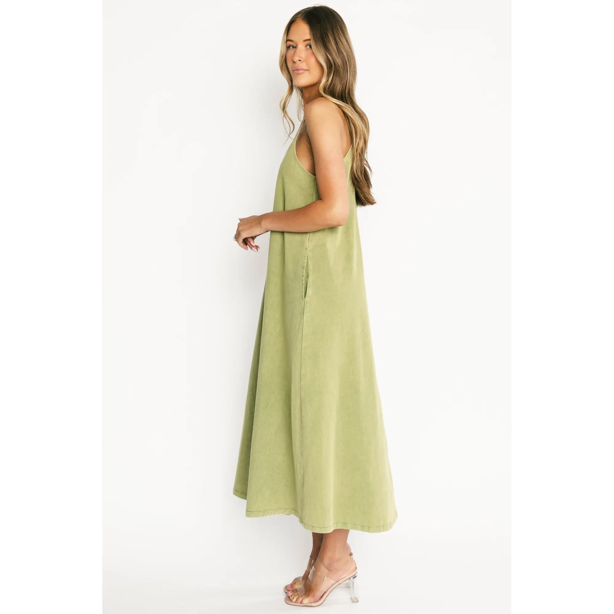 The Marcia Maxi Dress is a relaxed, straight-fit maxi cut in a green wash lightweight cotton that feels like soft denim. Designed for easy everyday wear, it balances simple lines with practical details so you can move comfortably from brunch to market runs.