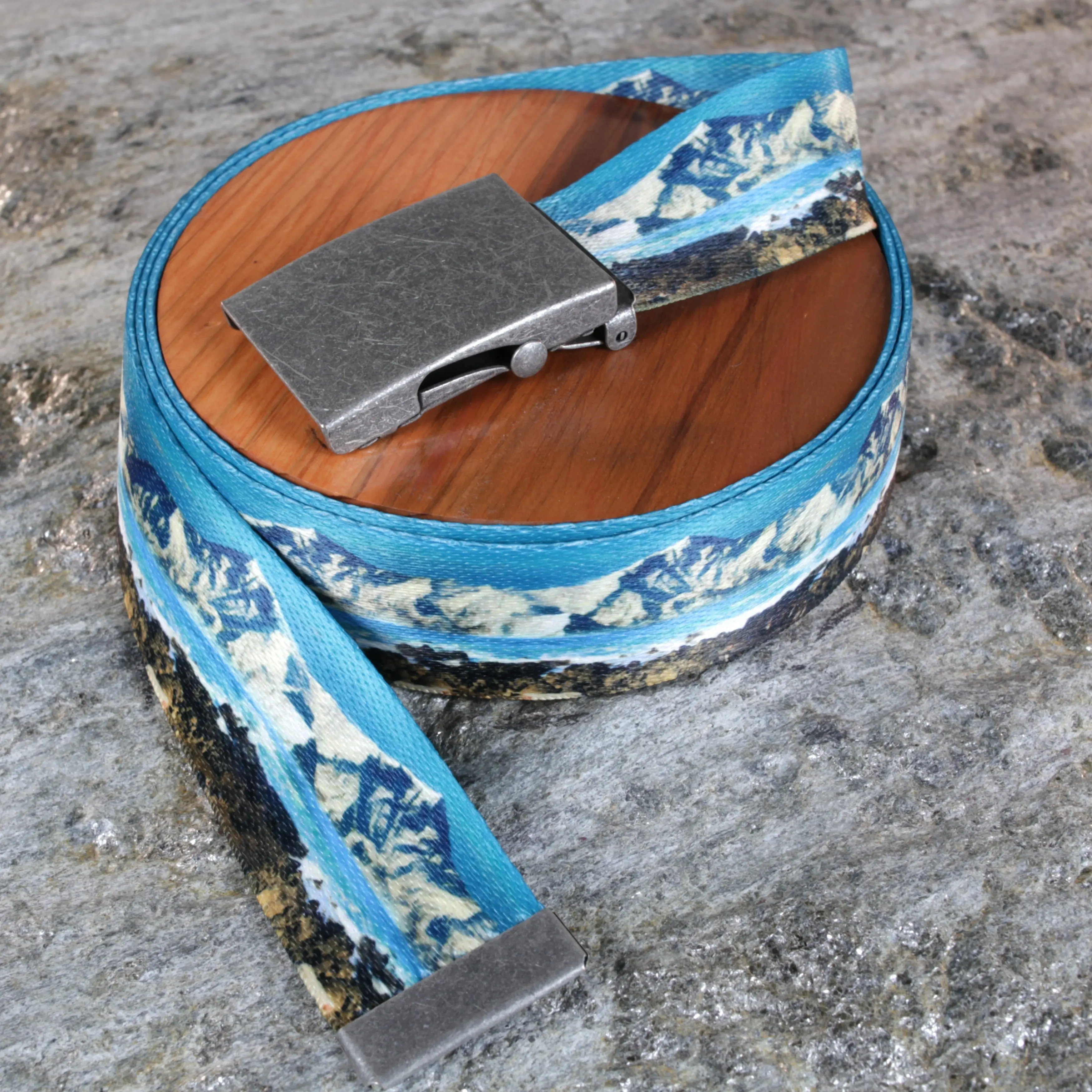 "description": "Range-inspired patterned belts with layered mountain-style designs. Multiple options available with a perfect no-hole fit. Made in the USA using durable polyester webbing and dye-sublimated prints, designed for comfort and long-lasting wear across all sizes.",