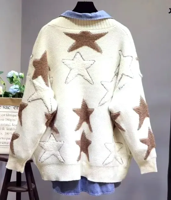 “Cozy star cardigan moment Oversized cream knit cardigan featuring textured star details and chunky buttons for that effortless layered look. Perfect over a tee or denim shirt for a cute, cozy, everyday outfit.”