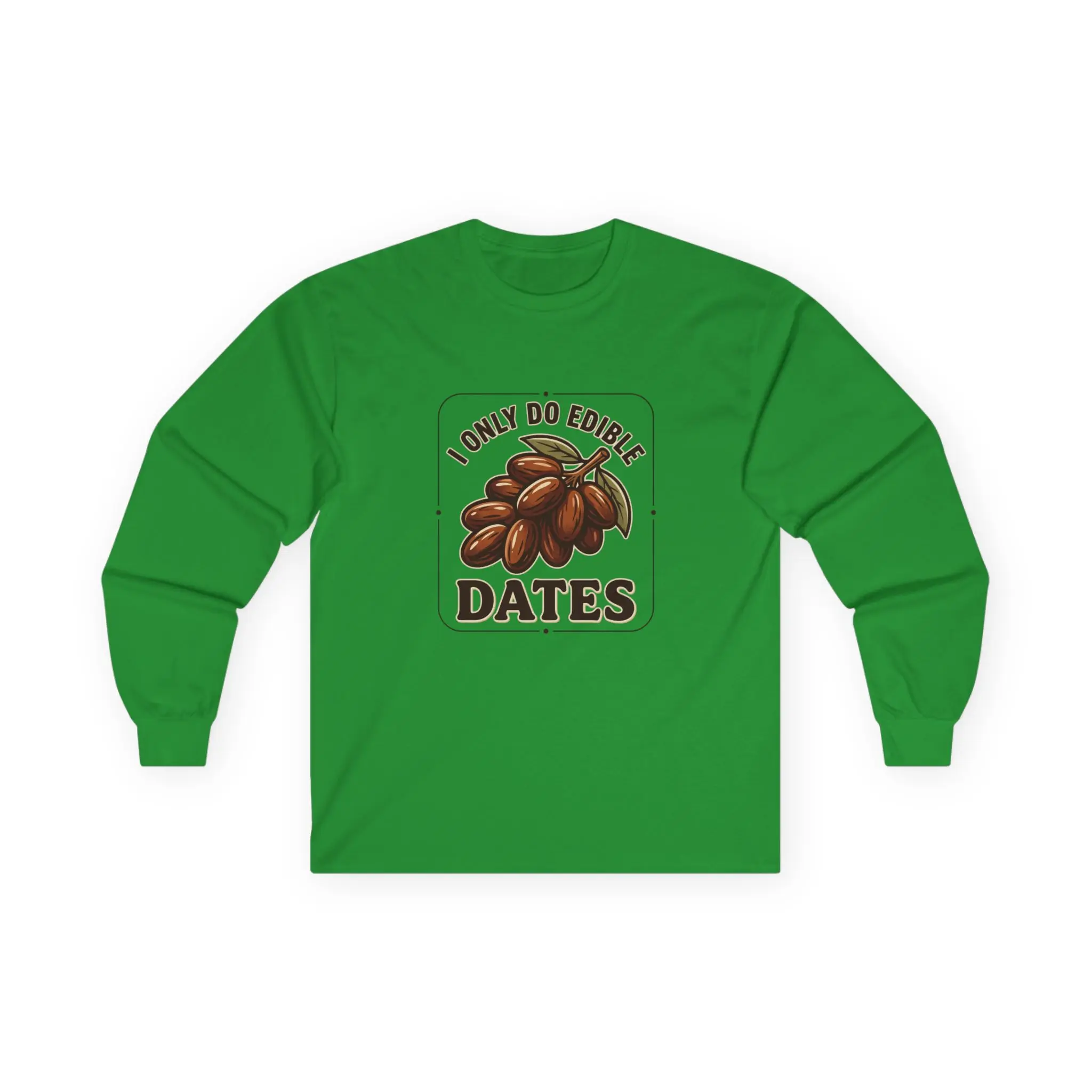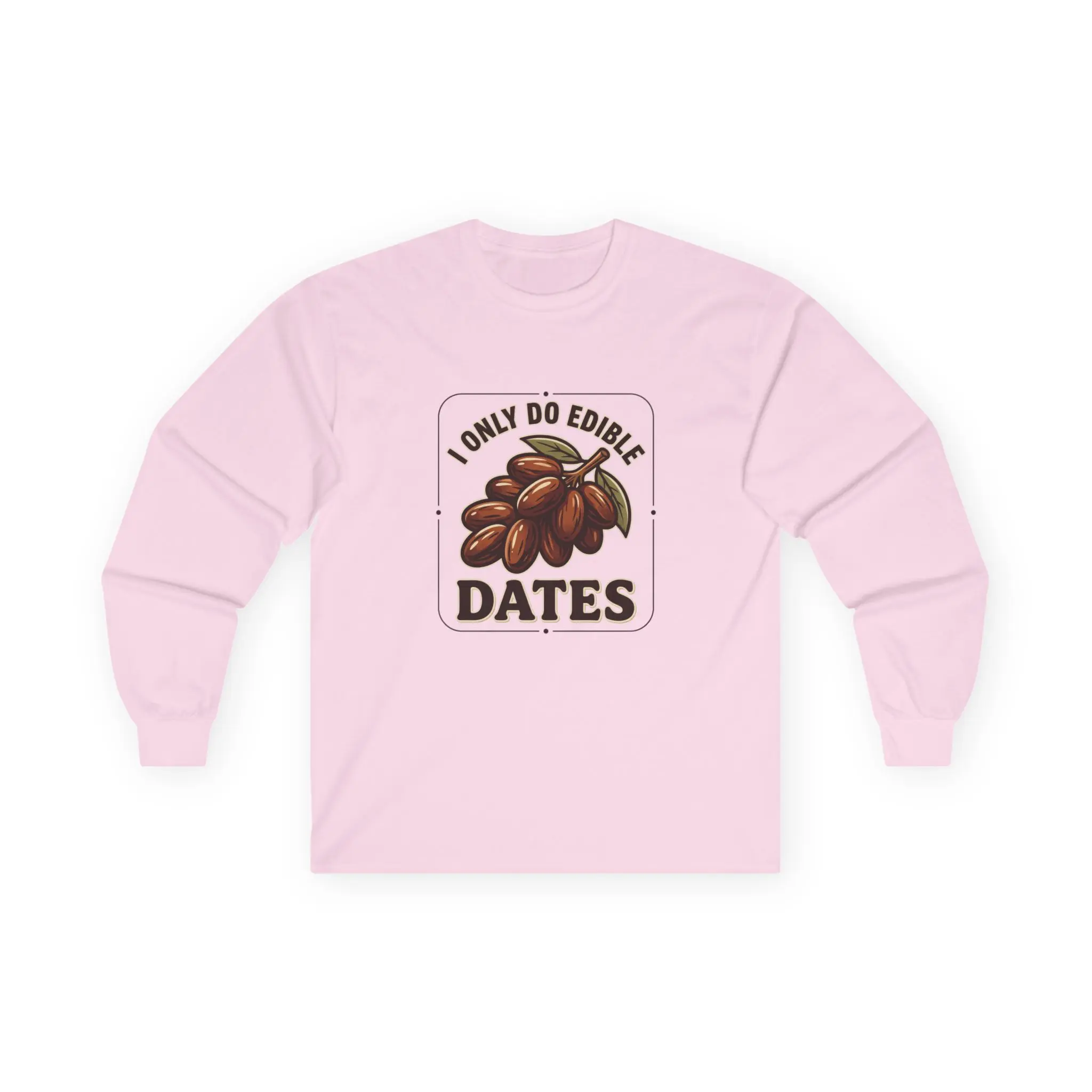 A cozy long-sleeve tee that feels like a vintage find and wears like a go-to layer. The front features a warm, hand-illustrated cluster of dates beneath the playful headline “I only do edible DATES,” bringing a touch of kitchen humor and autumnal warmth to casual outfits. The midweight cotton has a slightly thicker, vintage hand that drapes comfortably while the ribbed collar and shoulder tape keep the shape crisp after repeated wears. This shirt settles into weekend routines — slow coffee, farmers’ market runs, or low-key movie nights — and speaks to anyone who loves food-forward jokes and timeless, lived-in style.