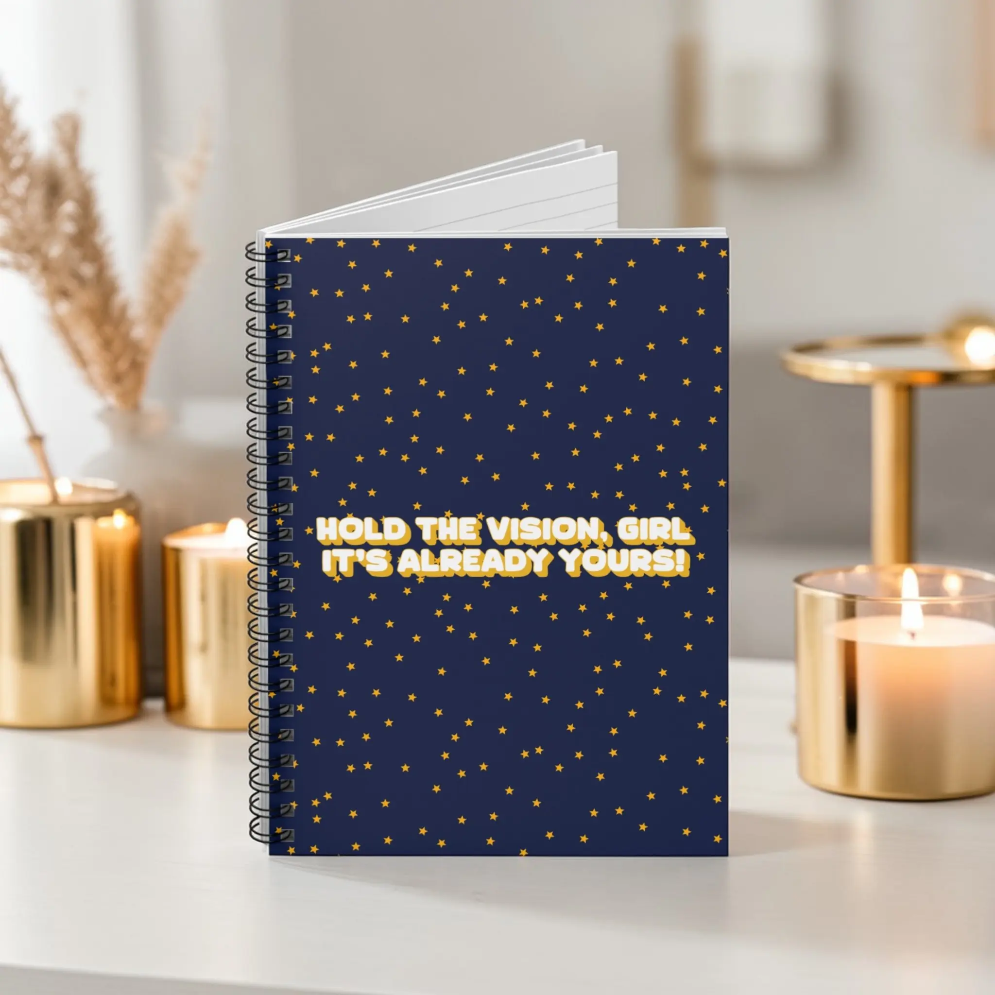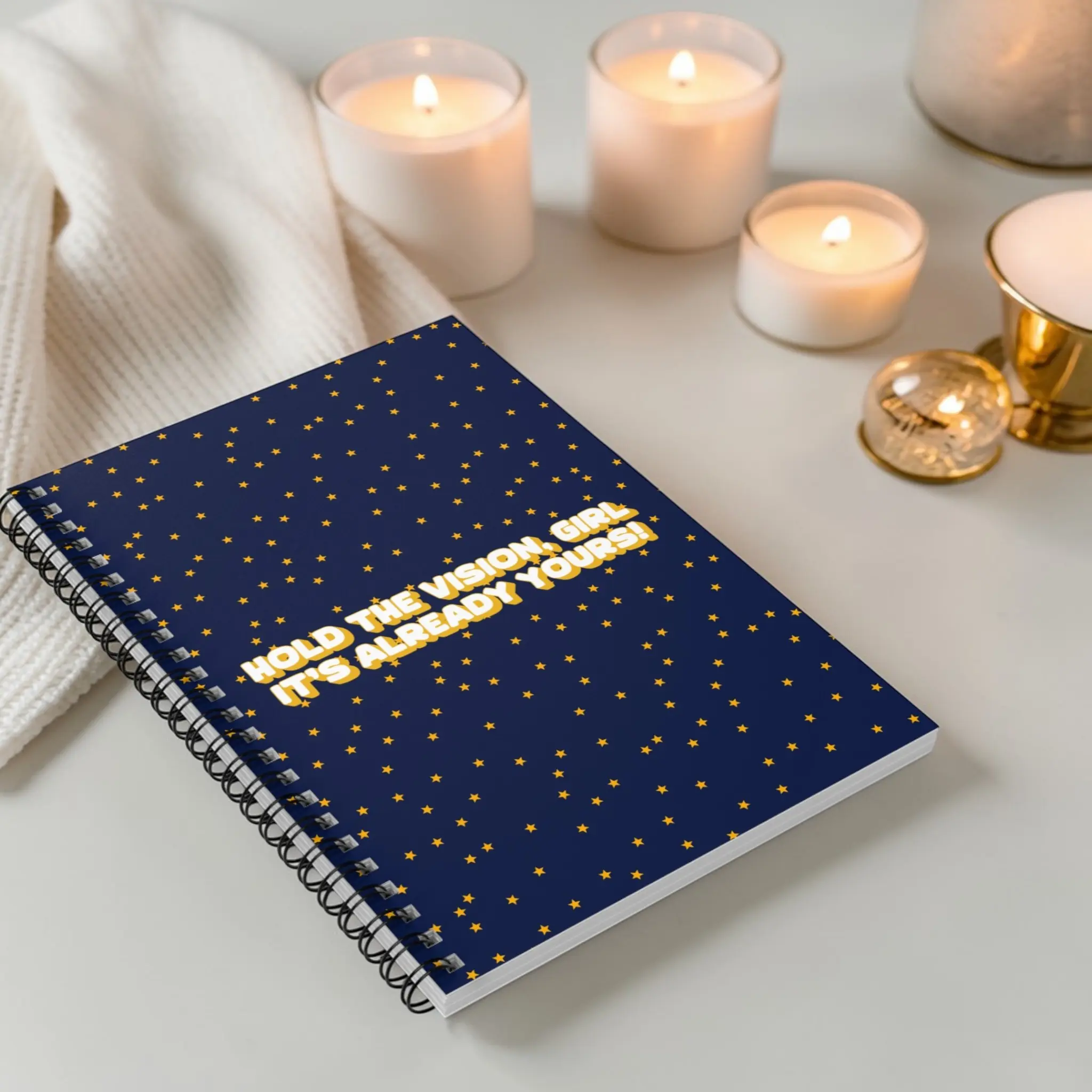 A soft, intentional notebook designed to hold your thoughts, your plans, and everything you’re becoming. The deep navy cover scattered with stars feels calm and focused, while the message Hold the vision, girl. It’s already yours. sits like a quiet reminder every time you reach for it.
