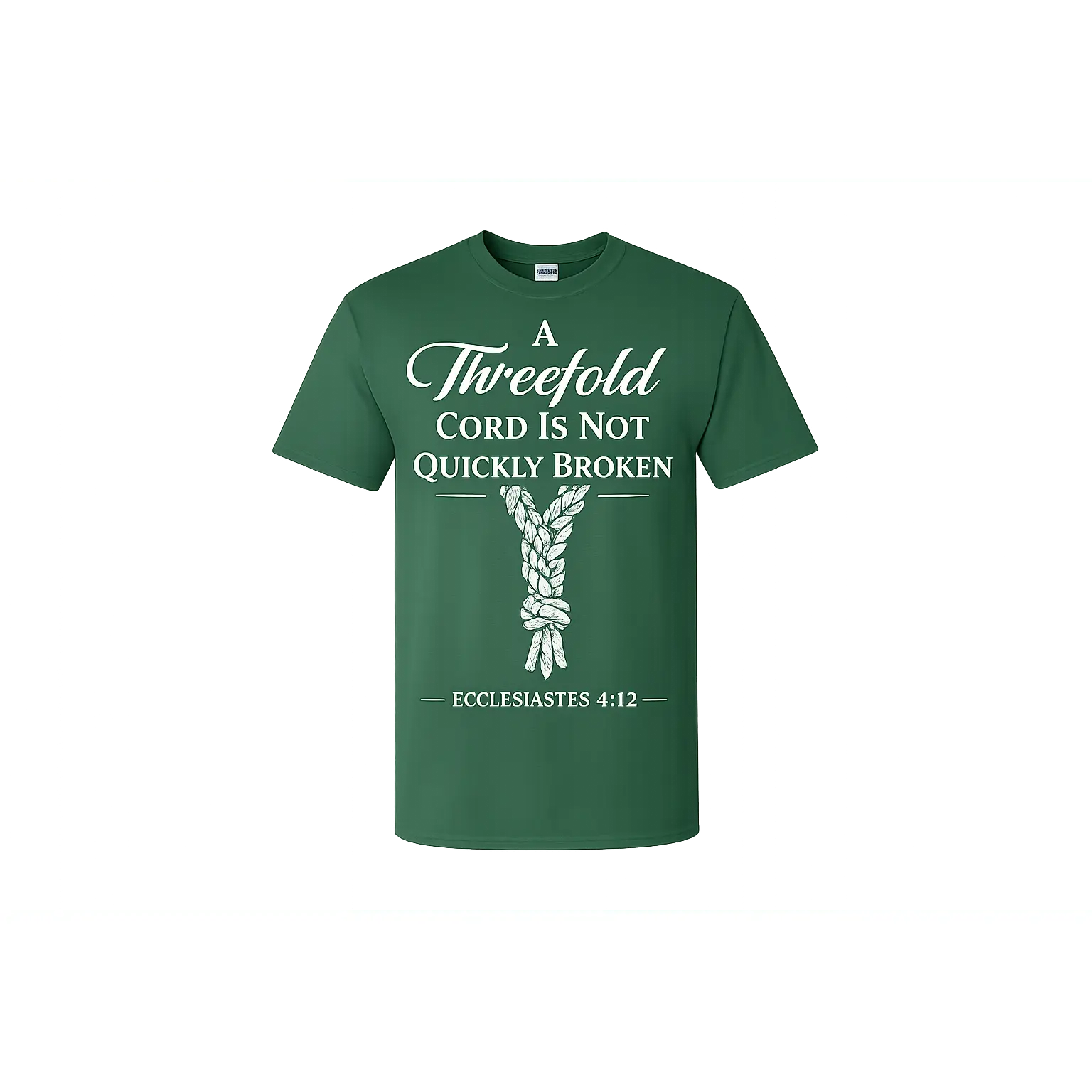 A green t-shirt featuring the powerful scripture “A threefold cord is not quickly broken” printed in bold white lettering. Beneath the words, a rope graphic symbolizes strength, unity, and God at the center. This design represents the unbreakable bond formed when faith, love, and commitment are woven together—perfect for everyday wear or a meaningful gift.