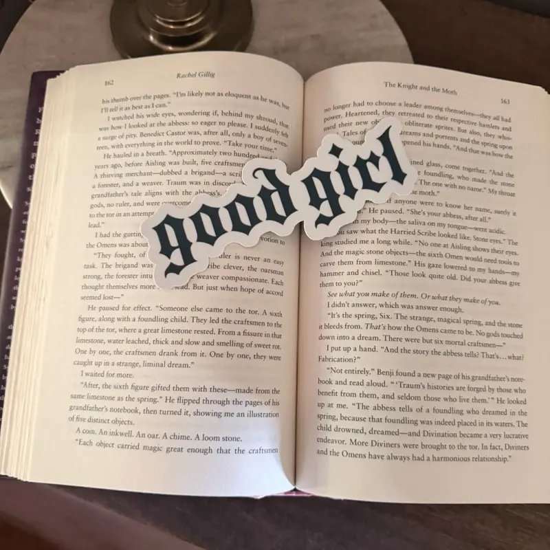 This handmade "Good Girl" bookmark is two words in bold gothic lettering that say everything dark romance readers need to hear. Stark black and white, die cut right to the shape of the text. No context needed. If you get it, you get it.