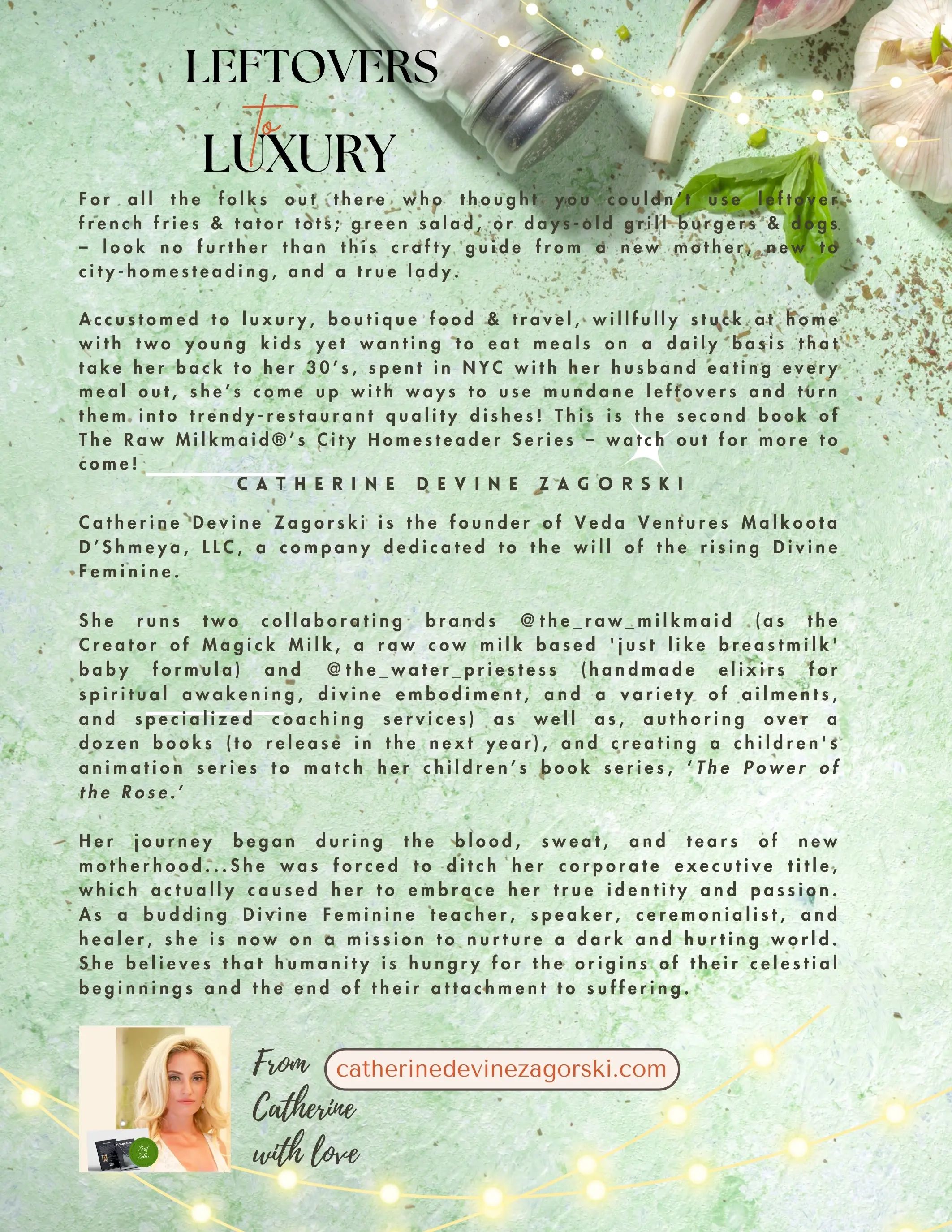 ·Accustomed to luxury, boutique food & travel, willfully stuck at home with two young kids yet wanting to eat meals on a daily basis that take her back to her 30's, spent in NYC with her husband eating every meal out, she's come up with ways to use mundane leftovers and turn them into trendy-restaurant quality dishes! This is the second book of The Raw Milkmaid(R)'s City Homesteader Series - watch out for more to come!