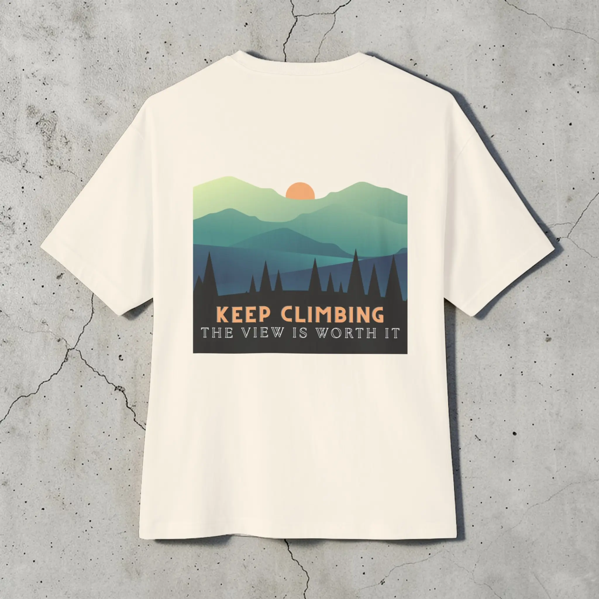 A calm, grounding graphic tee designed to remind you that progress takes time. Featuring a soft mountain landscape and the message Keep Climbing — The View Is Worth It, it brings a quiet kind of motivation to your everyday outfits.